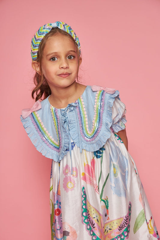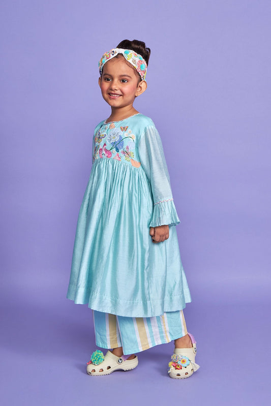 Sparrow Blue Hand Embroidered Cotton/Silk Kids Dress Co-ord Set - Joey & Pooh