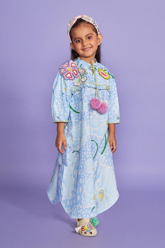 Mad Maze Hand Embroidered Kids Blue Cotton Long Dress