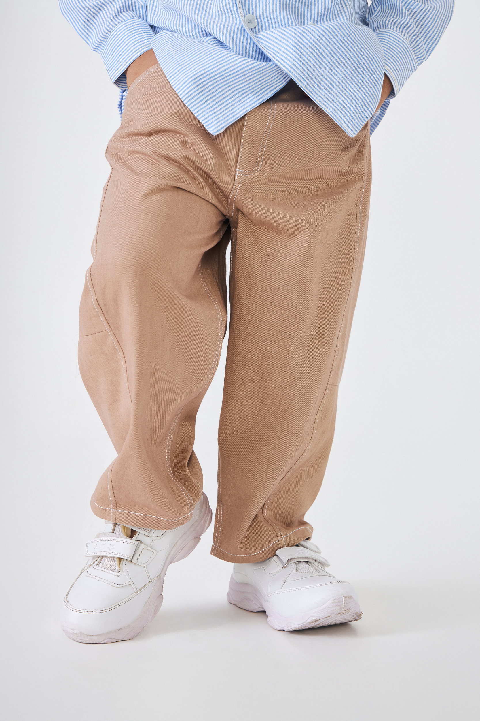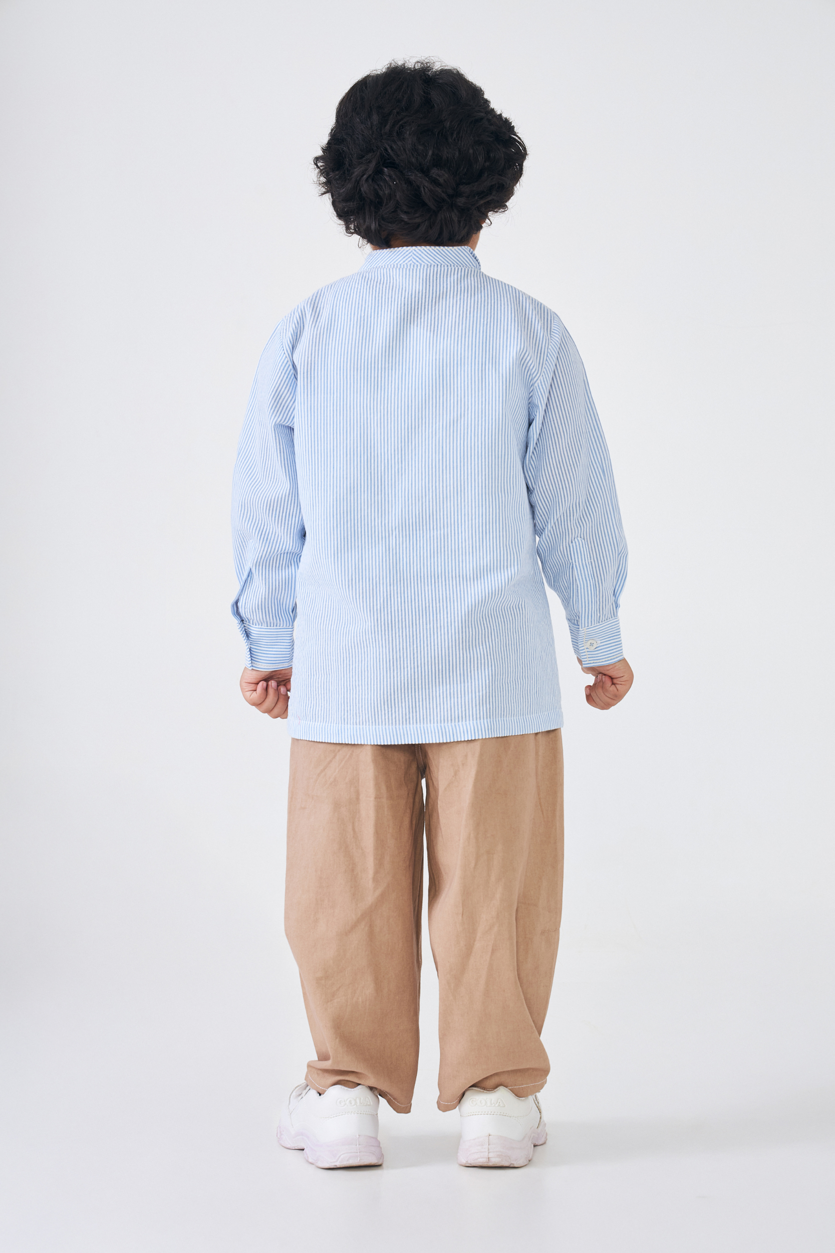 The Alba Stripe Boys Shirt is a Modern Twist on a Classic. Designed With a Front Cowl and Double-breasted Style, It’s Finished With Contrast Beige Buttons and Stitching for a Refined Touch. Pair It With Our Taupe Beige Twill Pants for a Smart, Contemporary Look.