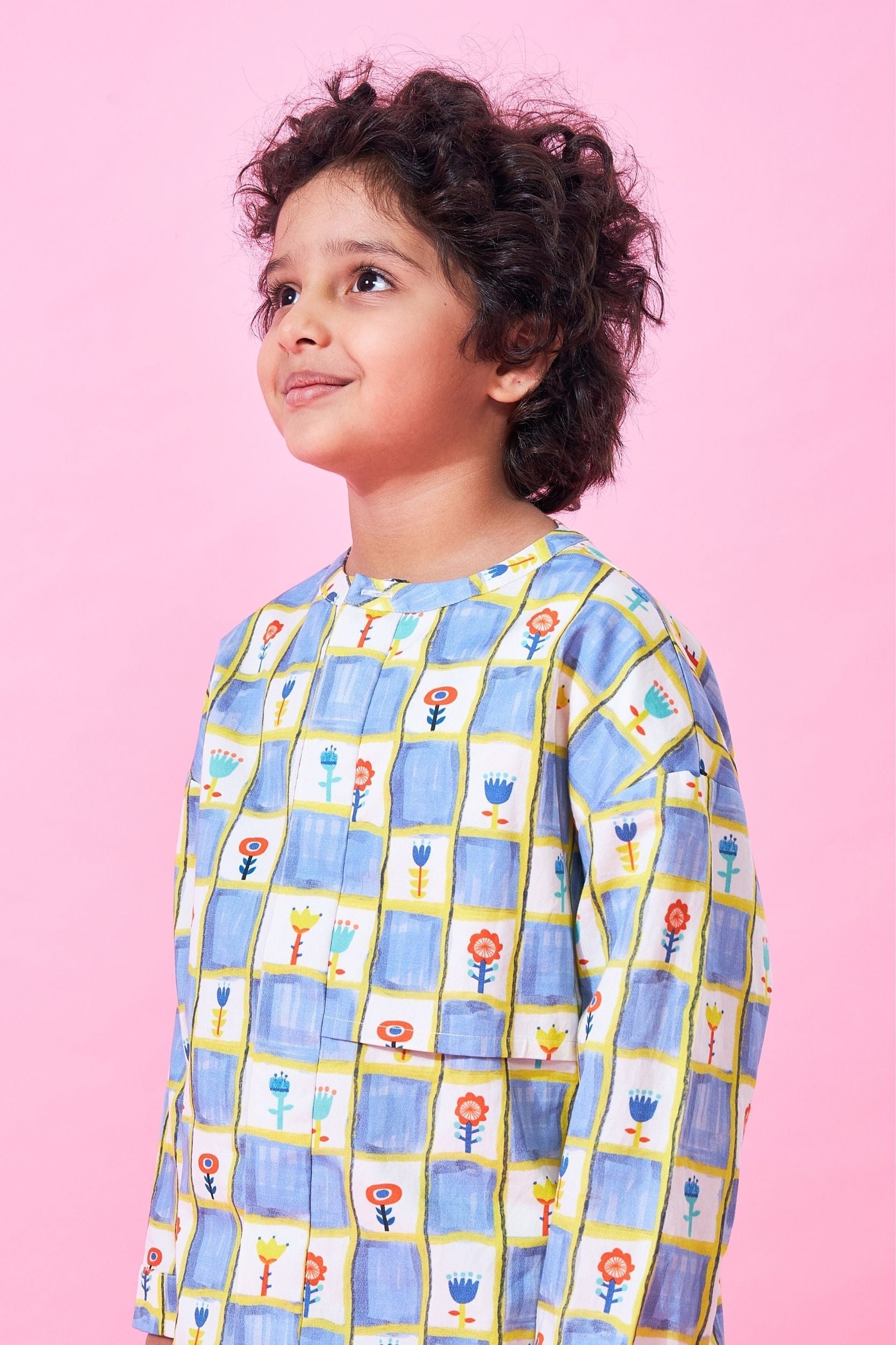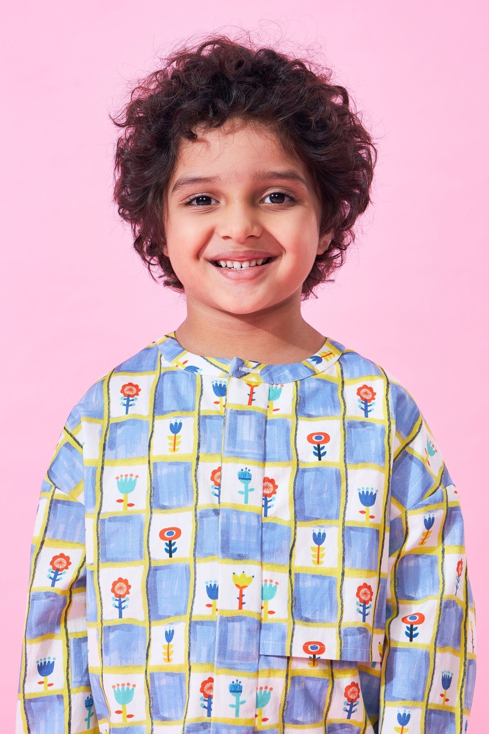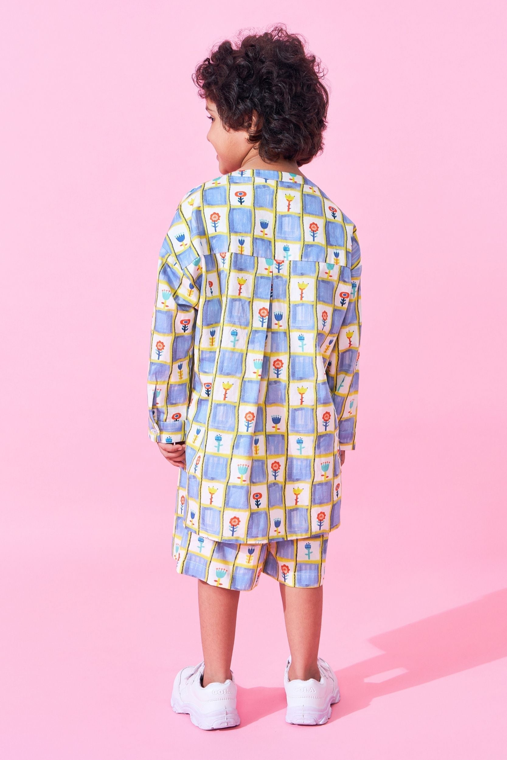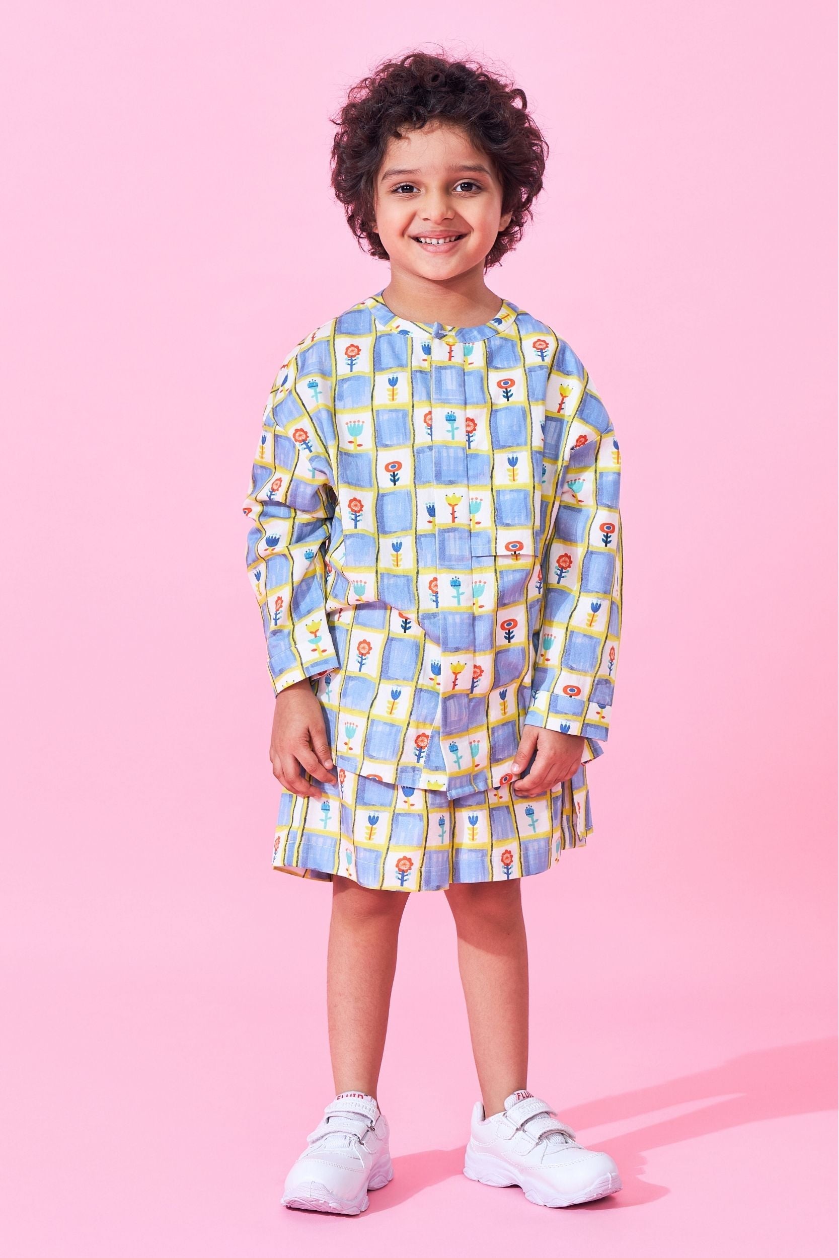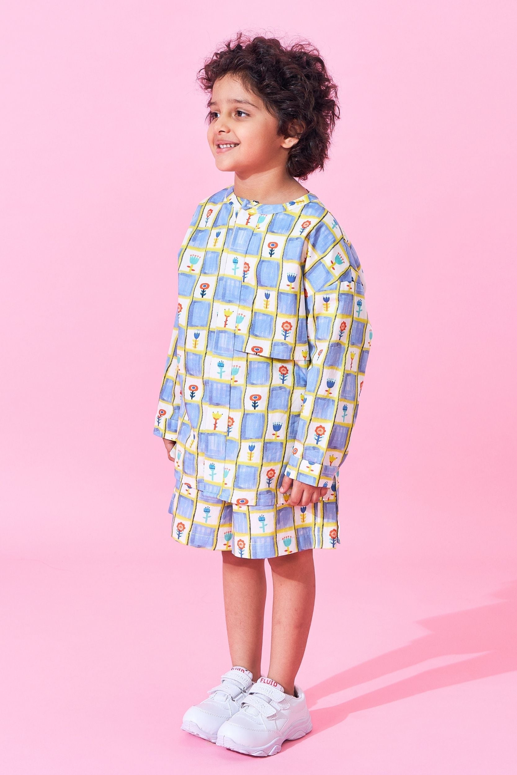 Designed for movement and joy, the unique cut adds character to the look, while the vibrant check print keeps things fresh and bold. Paired with matching printed shorts, this set is ready for anything — from playdates to outings, anytime, anywhere. Comfortable, cool, and full of personality.