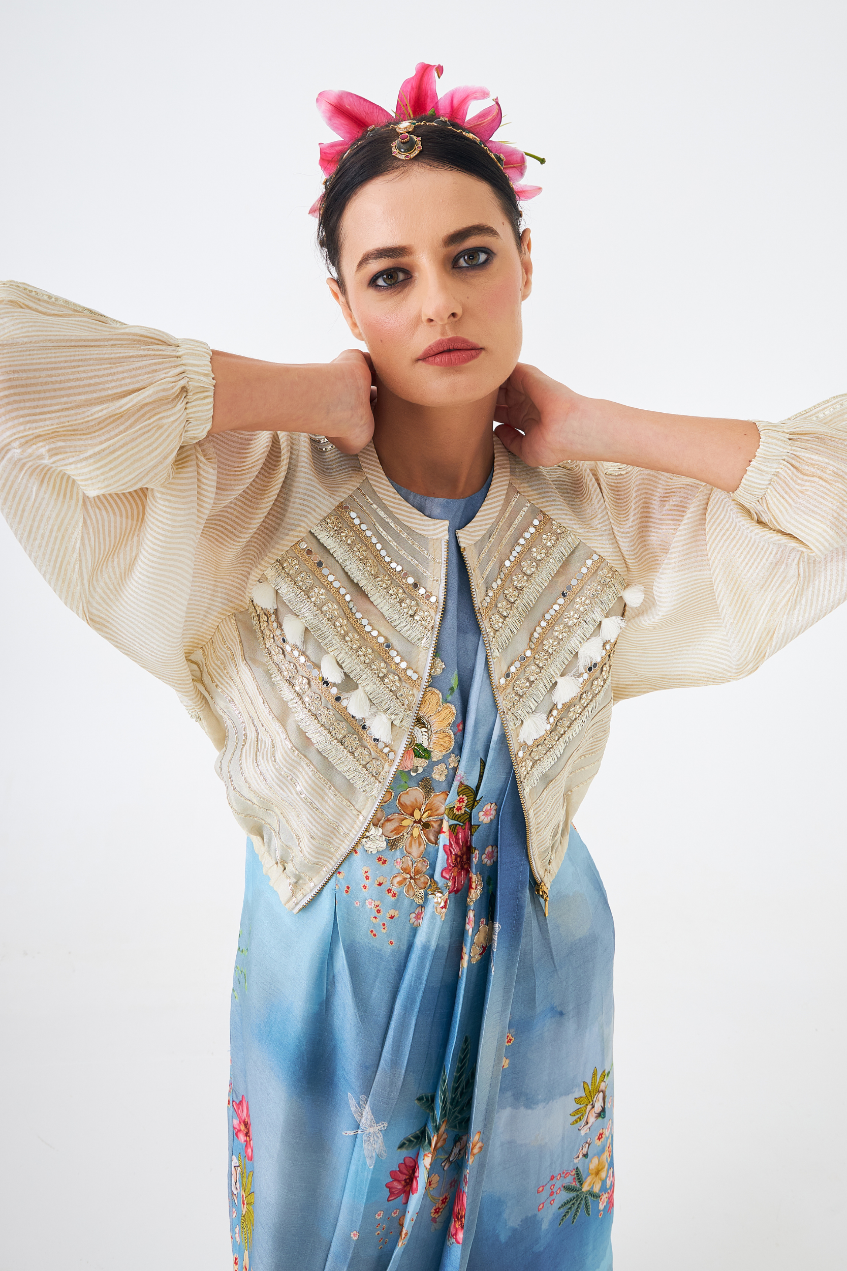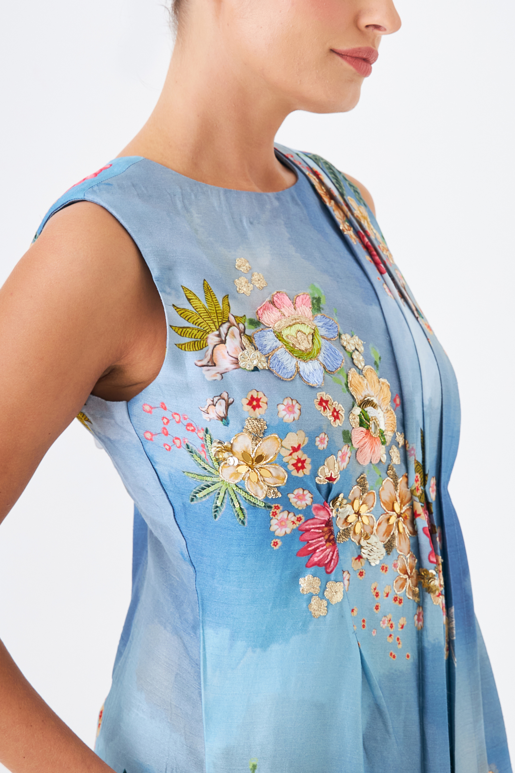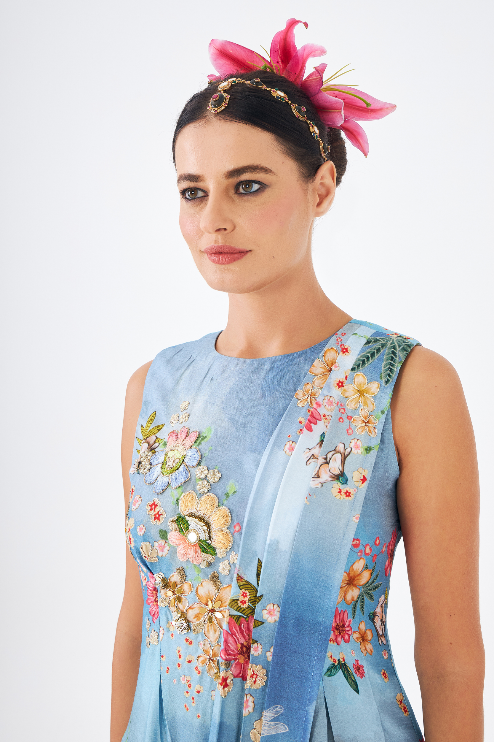 The Clea Print Embellished Long Dress is a Stunning Blend of Artistry and Modern Design. Featuring a Soft Floral Print Over a Blue Watercolour Base, It’s Detailed With a One-shoulder Pleat and an Elegant Slit for a Contemporary Touch. Intricately Hand-embellished With Gold Pitta Work, Tikki, Cutdana, and Acrylic Sequins, This Dress Shimmers With Craftsmanship. Cocktail Parties, Evening Galas, Festive Celebrations, or Intimate Family Gatherings. Designed to Flatter With Its Effortless Fall and Luxurious Finish, This Long Dress is Perfect for Women Who Want to Stand Out With Grace and Sophistication. A Versatile Silhouette That Embodies Luxury Occasion Wear With Indian Embroidery Detailing.