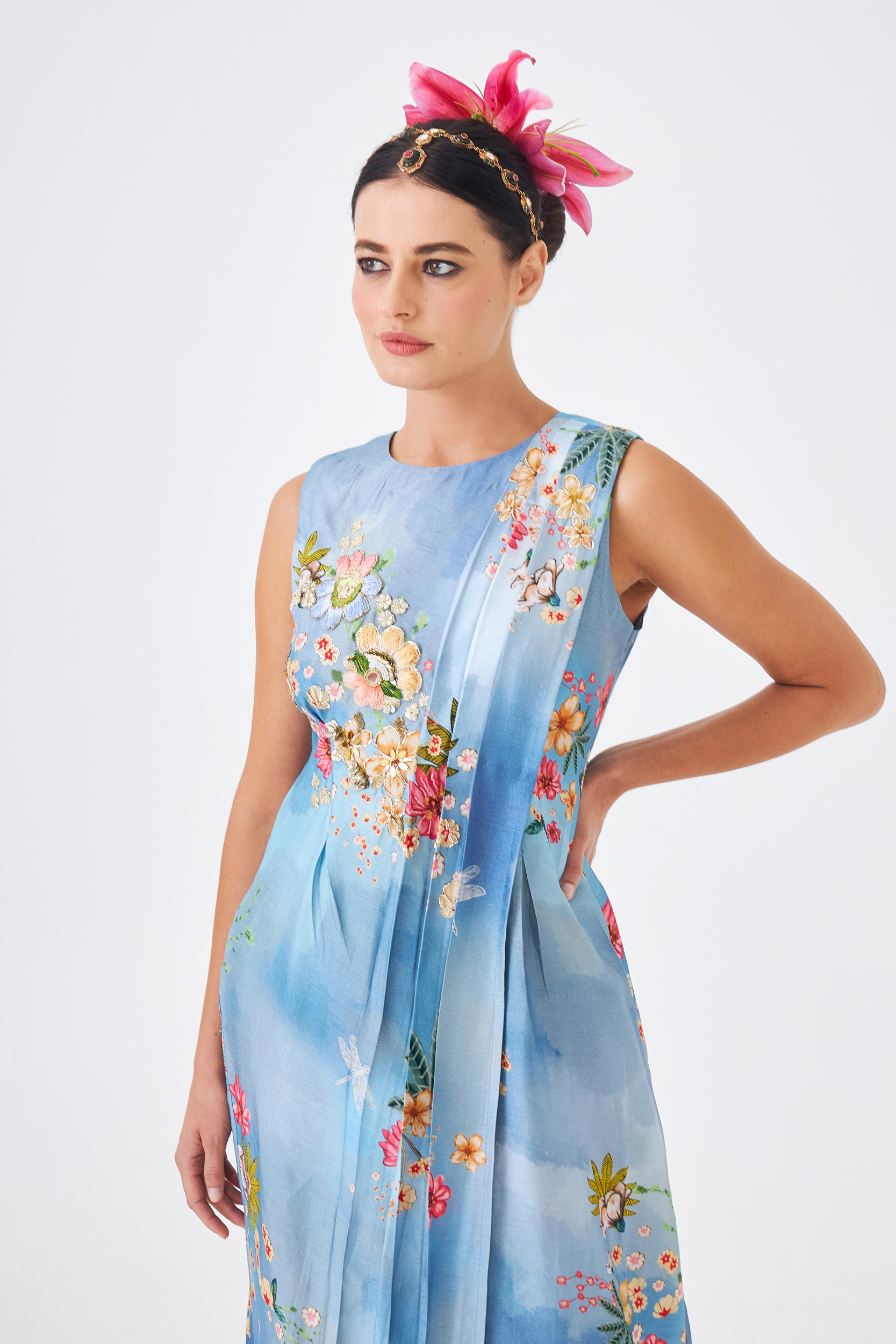 - Ankle-length Dress in a Dreamy Blue Watercolour Floral Print.