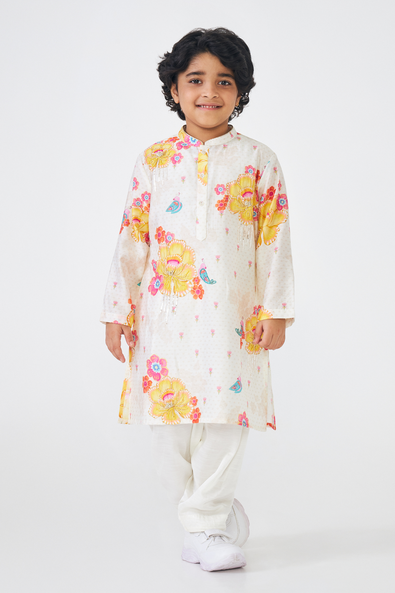 Bright and Festive, the Freya Mustard Boys Kurta & Pant Set Brings a Playful Twist to Tradition. The Kurta is Designed in a Cheerful Mustard Floral Print With Subtle Hand Embellishments, Paired With Crisp White Pants for a Smart and Easy Look. A Perfect Choice for Little Ones to Shine at Weddings, Festivals, or Family Celebrations.