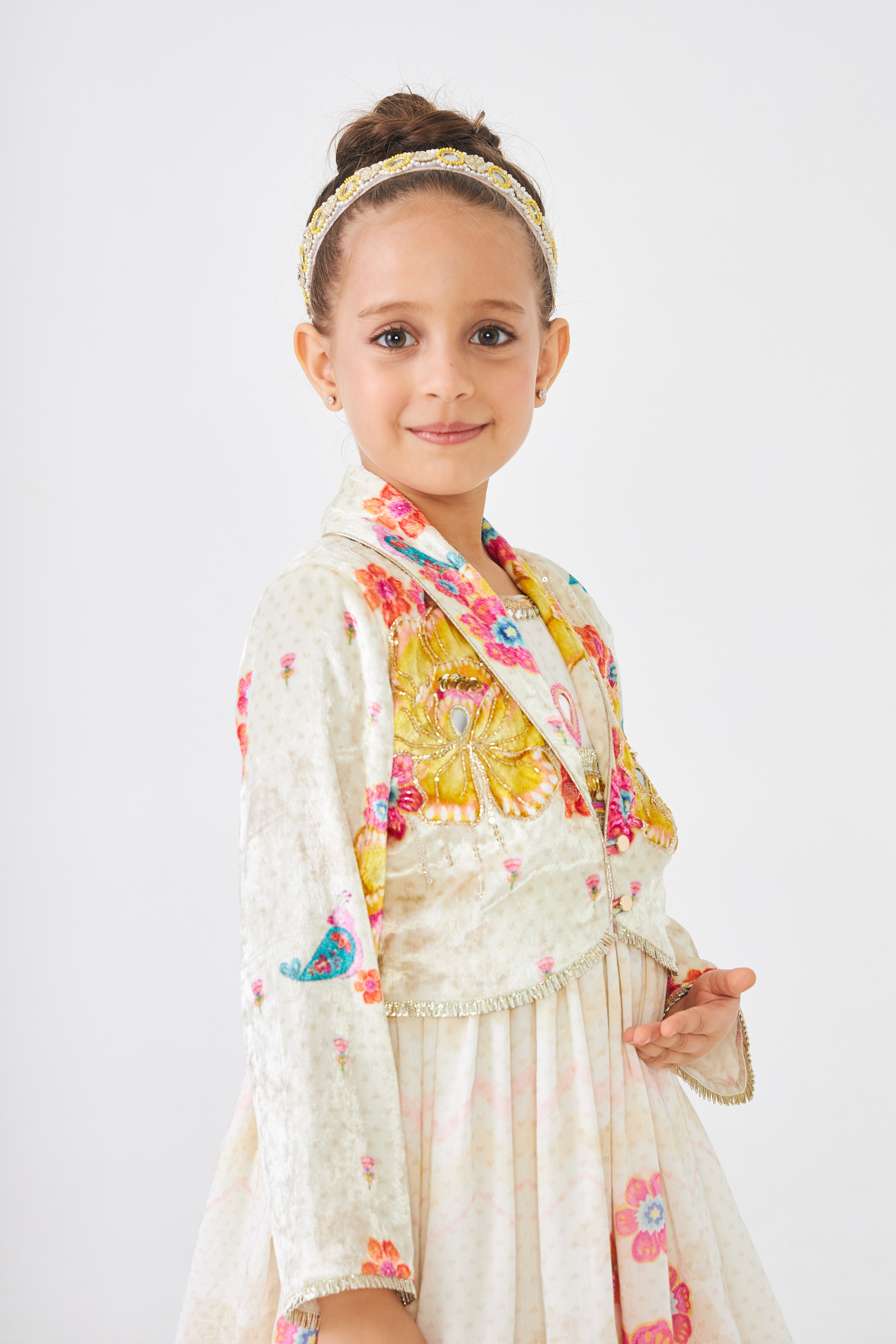 Get Ready to Dazzle, the Freya Mustard Girls Long Dress (2 Pcs) is a Statement Festive Gown for Little Divas. It Features a Sleeveless Embroidered Yoke With Mirror, Cutdana, and Sequin Work, Accented With Contrast Pink Straps. The Full Flared Skirt With Can-can Adds Drama and Charm. Paired With Our Cozy Printed and Embellished Velvet Jacket—perfect for Receptions, Evening Soirees, and Special Celebrations.