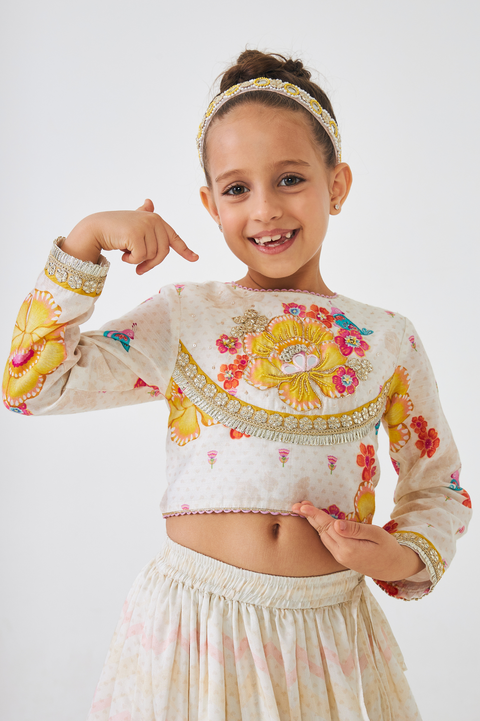 The Freya Mustard Girls Embellished Top & Lehenga Set (3 Pcs) is a Festive Stunner Crafted With Delicate Details. The Crop Top Features an Embroidered Yoke With Pitta, Mirror, Tikki, and Gold Gota Flowers, Styled With Full Sleeves, a Centre-back Button Opening, and a Contrast Mustard Bow Tie-up. Paired With a Heavily Embroidered Lehenga With Can-can and Tassel Accents, and a Soft Off-white Net Dupatta With Gota Edging, This Set is Perfect for Weddings, Festive Occasions, and Special Celebrations.