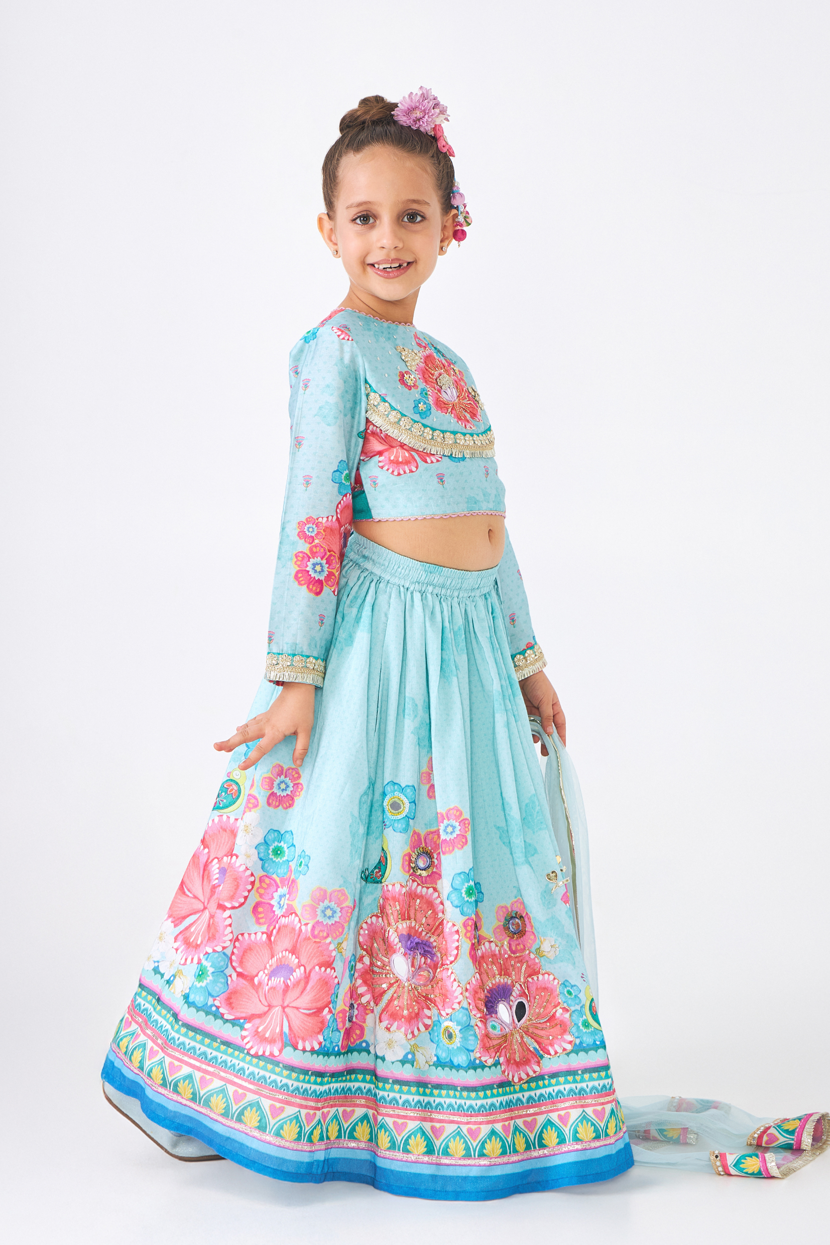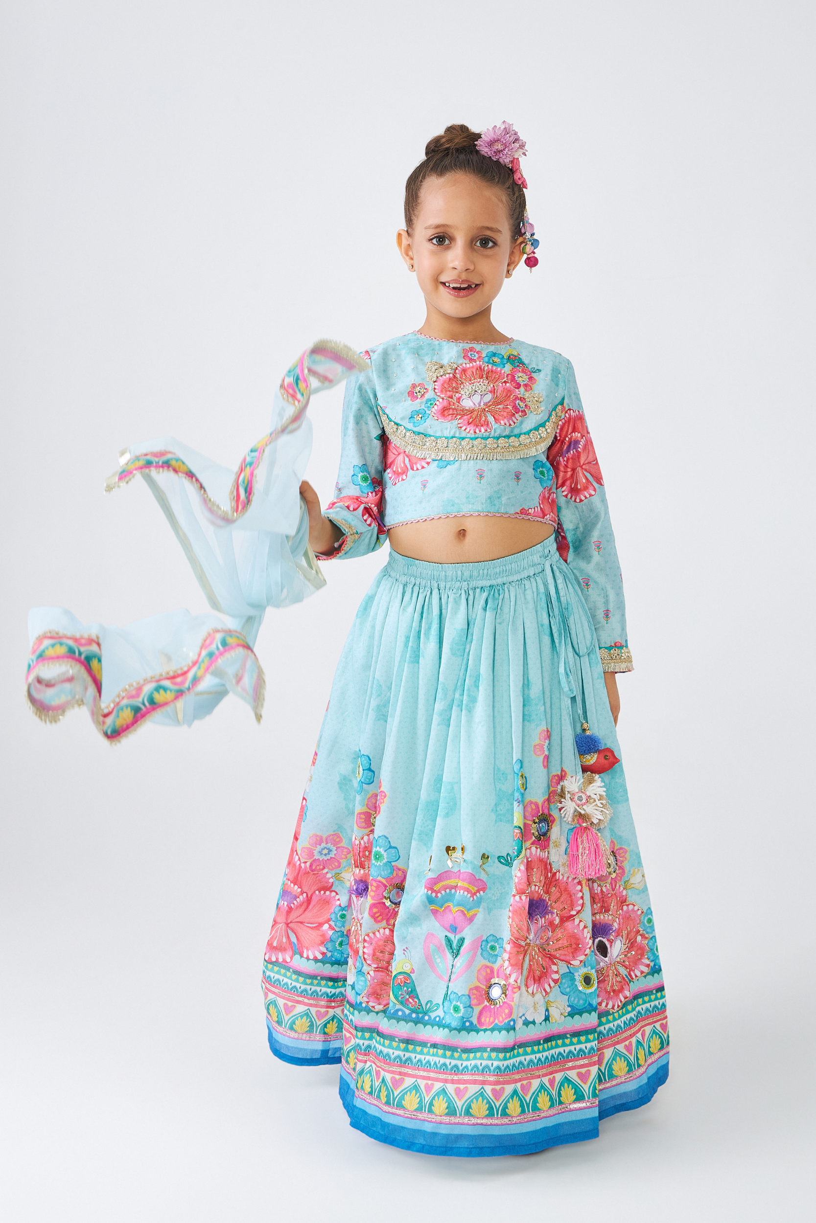 Freya Sage Girls Embellished Top & Lehenga (Set of 3 Pcs)