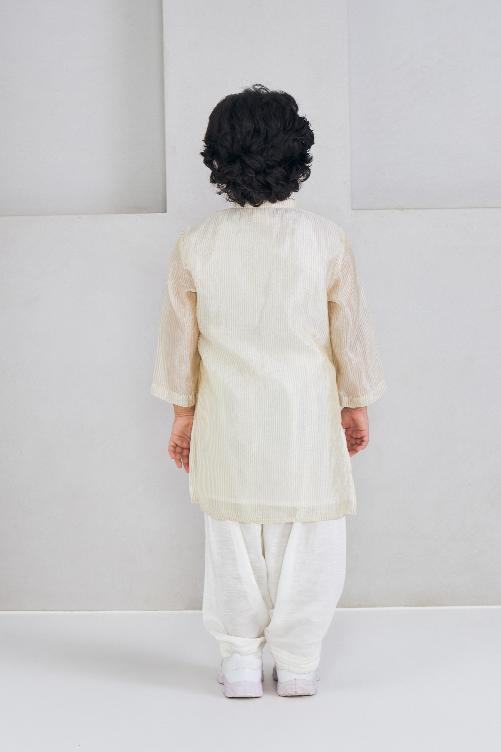 The Ivora Boys Embellished Kurta & Pant Set (2 Pcs) is a Regal Festive Outfit Crafted From Gold Stripe Tissue Fabric. The Kurta Features a Gota and Mirror-embroidered Front Yoke With Playful White Tassels, Paired With Crisp White Trousers. Elegant Yet Comfortable, It’s the Perfect Choice for Weddings, Festivities, and Special Celebrations.