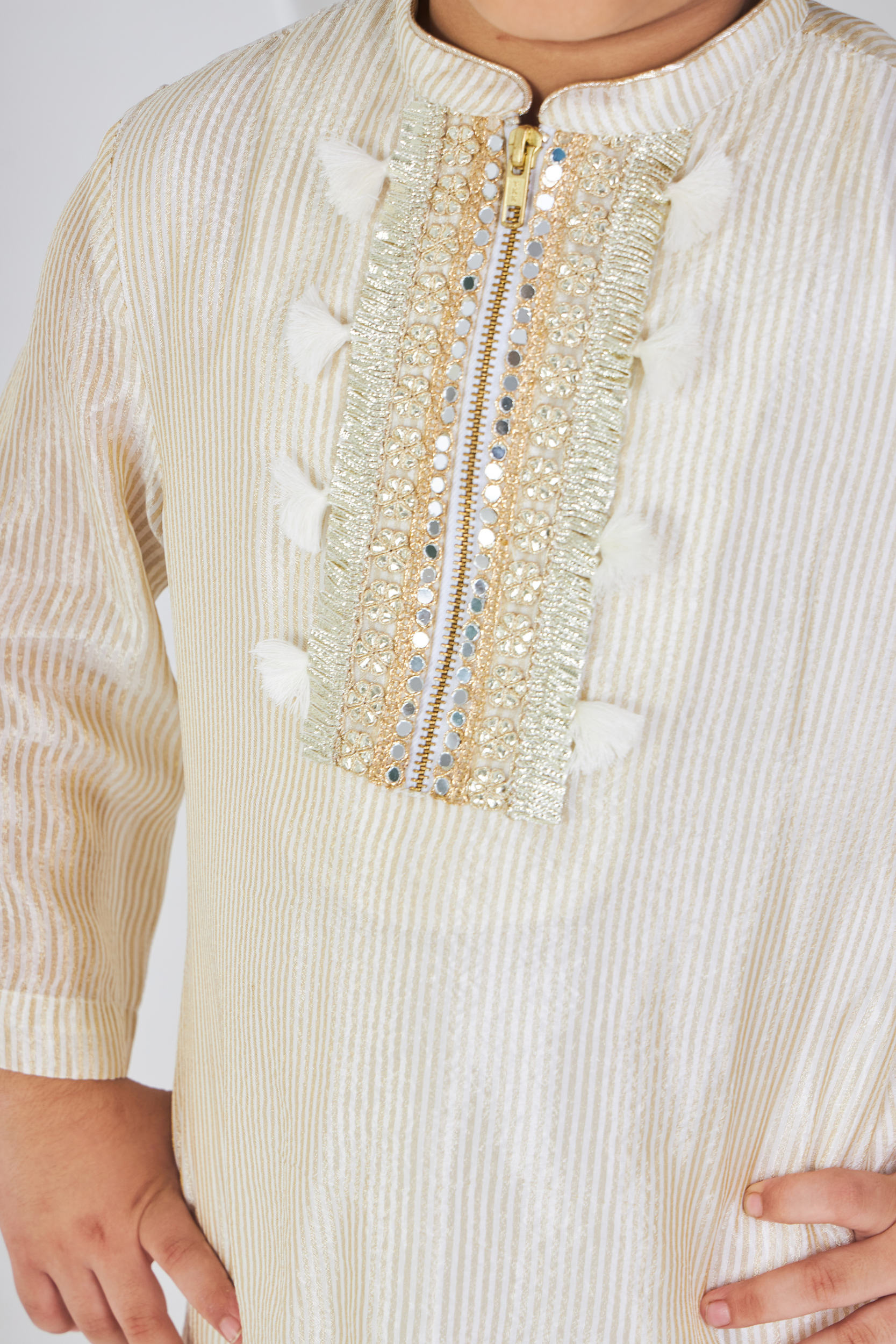 - Gold Stripe Tissue Kurta With Gota & Mirror Yoke Embroidery & Front Zipper.