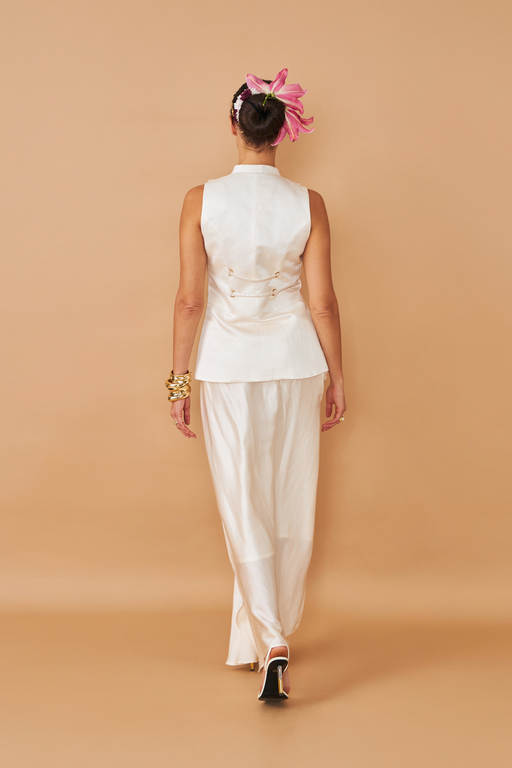 - Two - piece Co ord Set : Embellished Waistcoat & Draped Skirt.