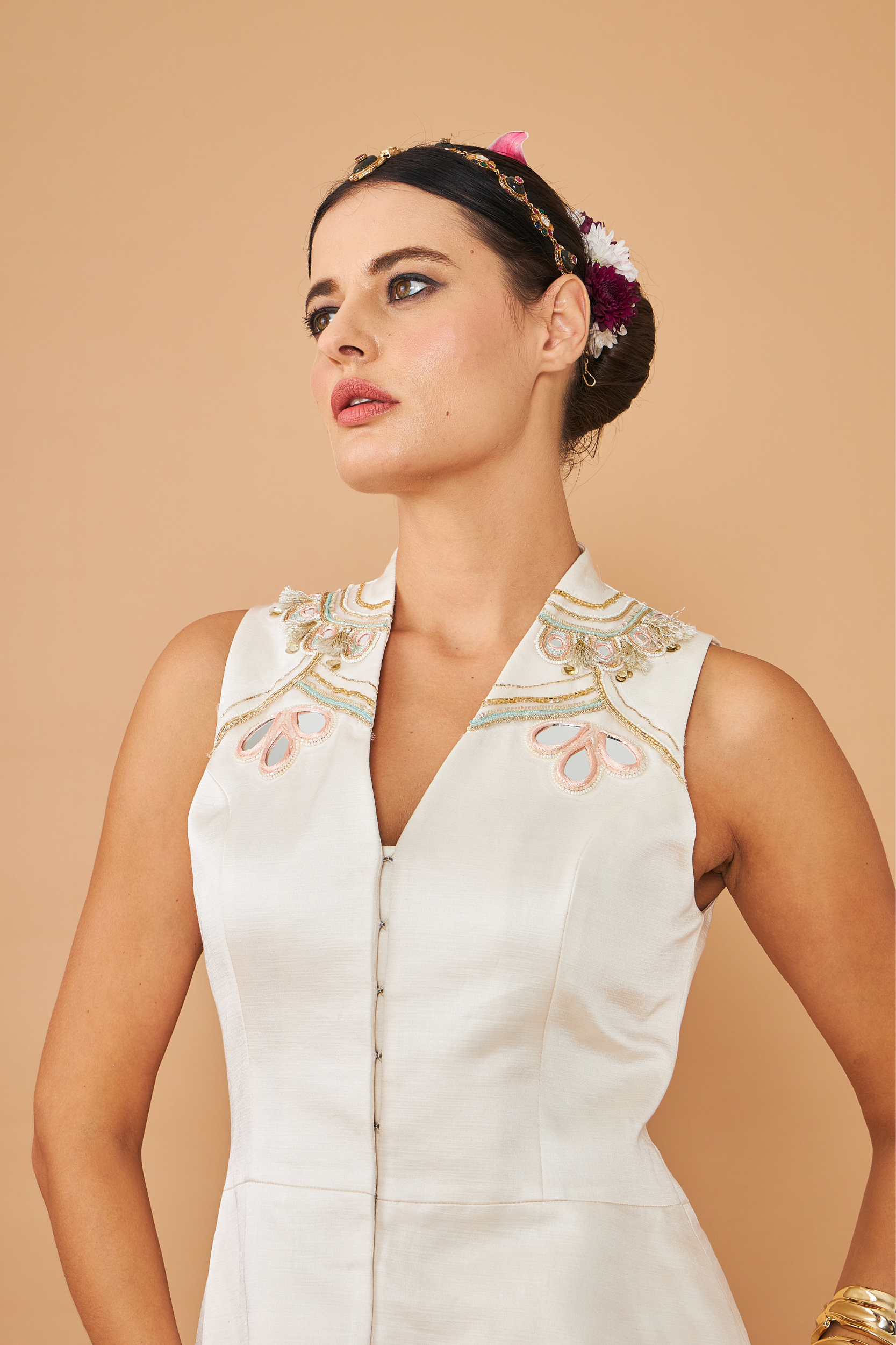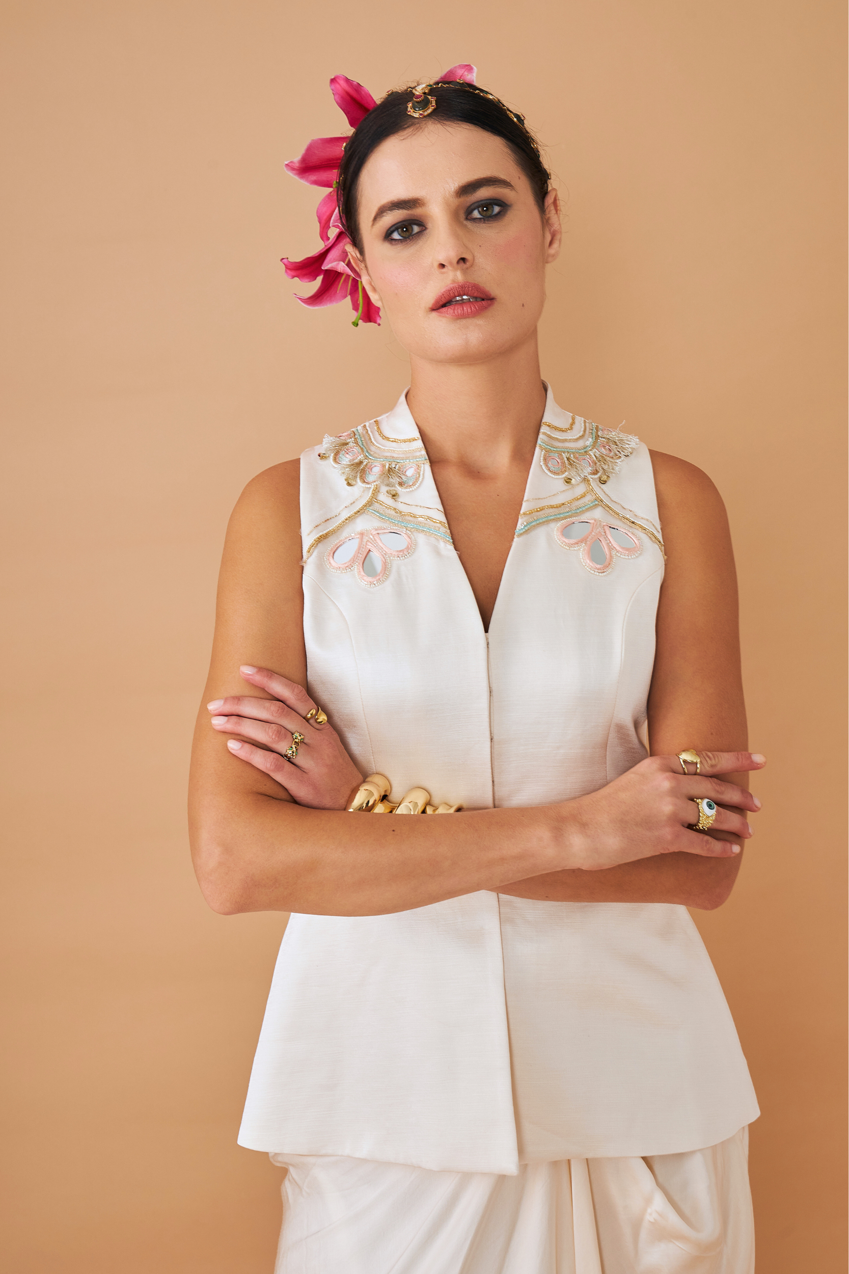 - Waistcoat in Ivory With Dori, Mirrorwork, Pitta & Cutdana Detailing.