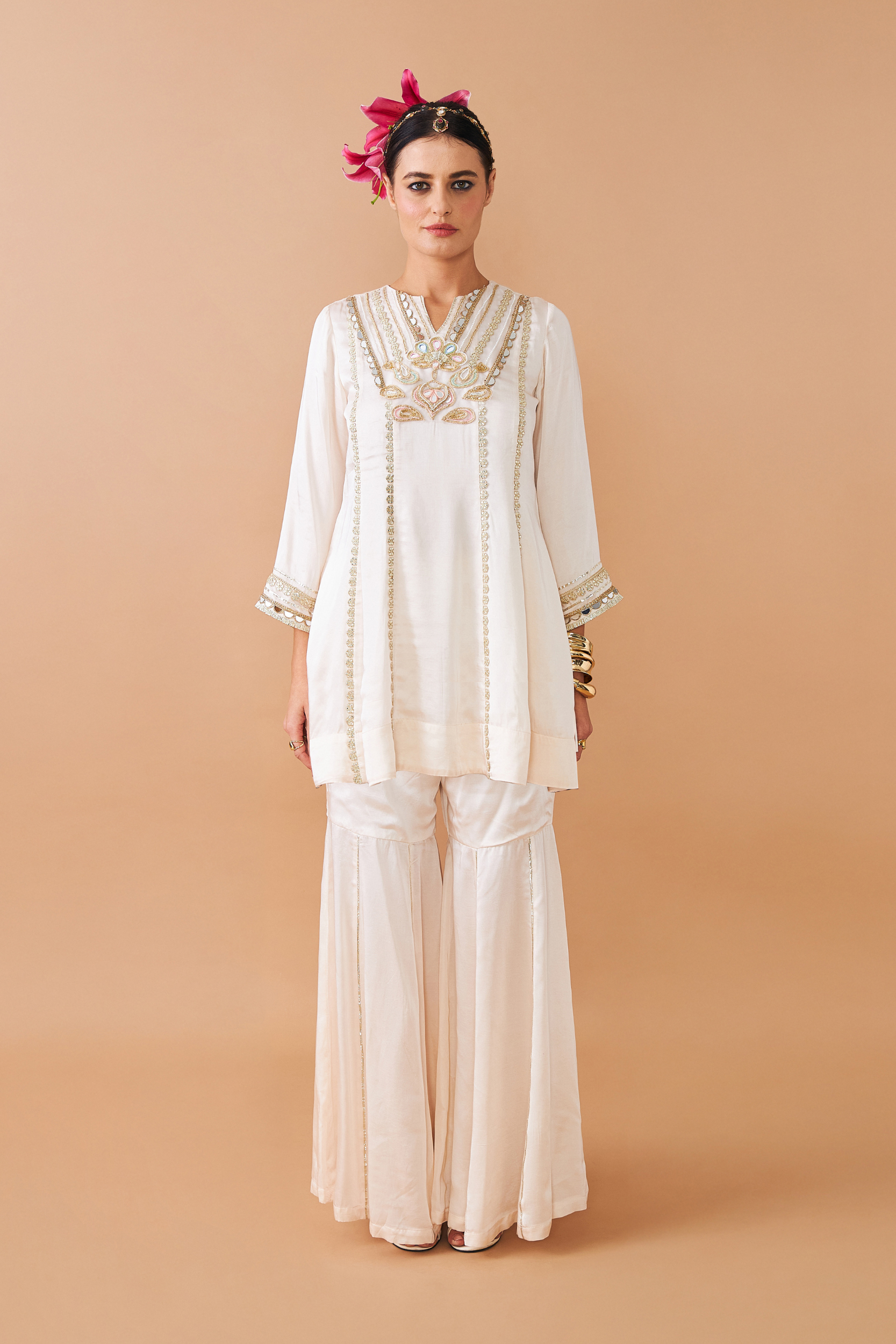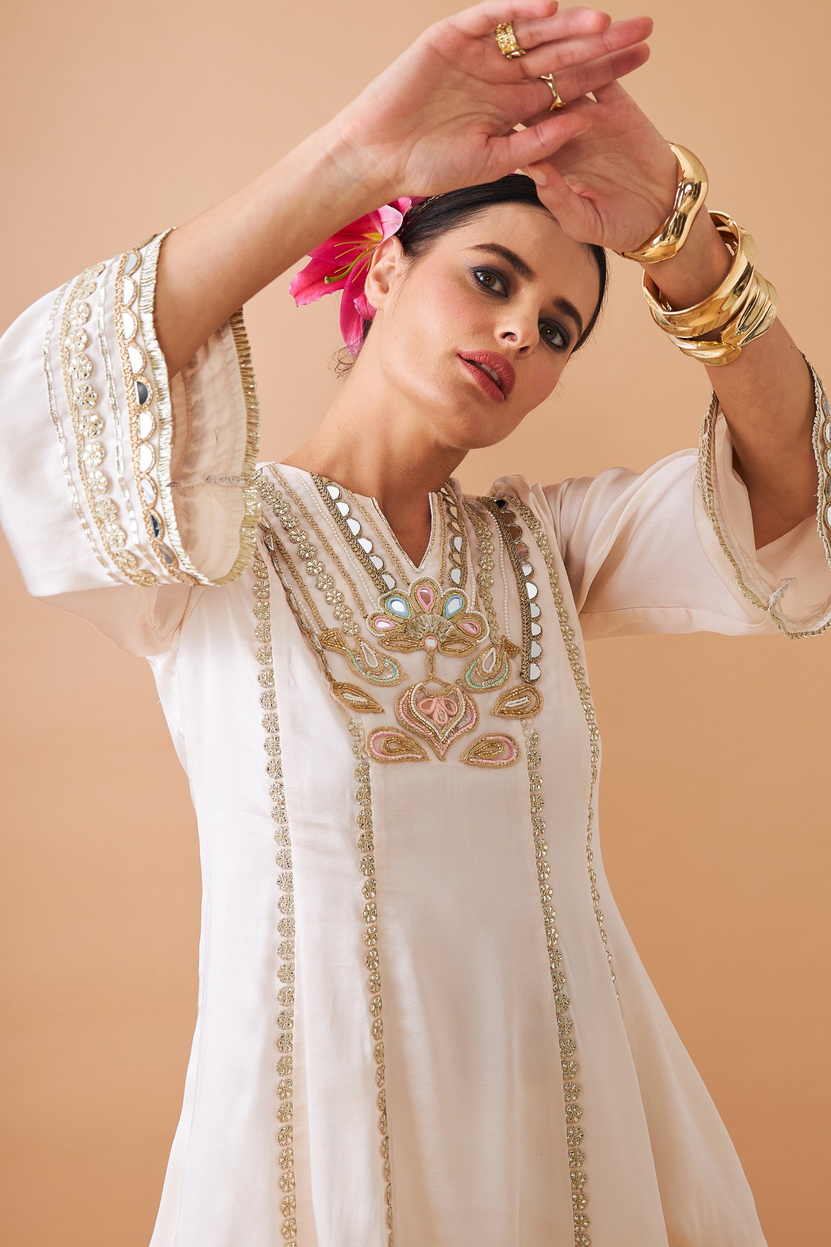 The Ivora Embellished Tunic With Flared Trousers Co-ord is an Elegant Ivory Ensemble Designed for Timeless Sophistication. The Tunic Features Delicate Threadwork, Dori, Mirrorwork, Pitta, and Cutdana Embellishment, With Flowing Kalis/panels Highlighted by Floral Gota Insertions for Added Texture. Flared 3/4th Sleeves With Detailed Hems Complete the Graceful Silhouette, While the Soft Construction and Full Lining Ensure Comfort. Paired With Solid Fitted Trousers That Flare From Below the Knee, Half-lined and Elasticated at the Back, This Co-ord Balances Artisanal Craft With a Modern, Flattering Fit. Perfect for Festivities, Evening Occasions, and Elegant Celebrations.