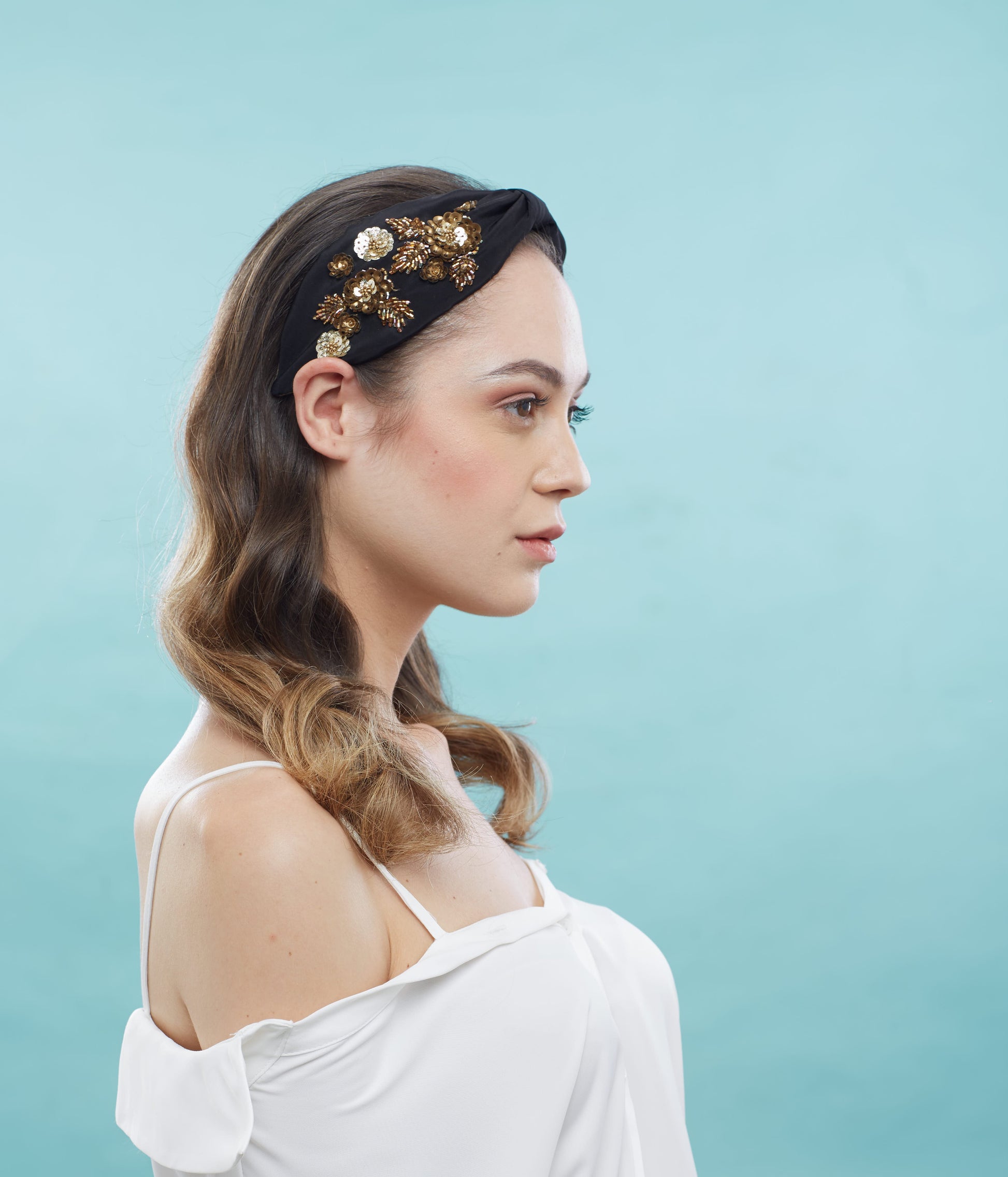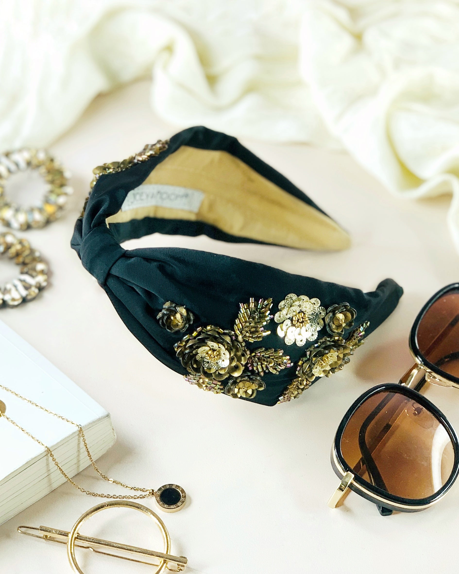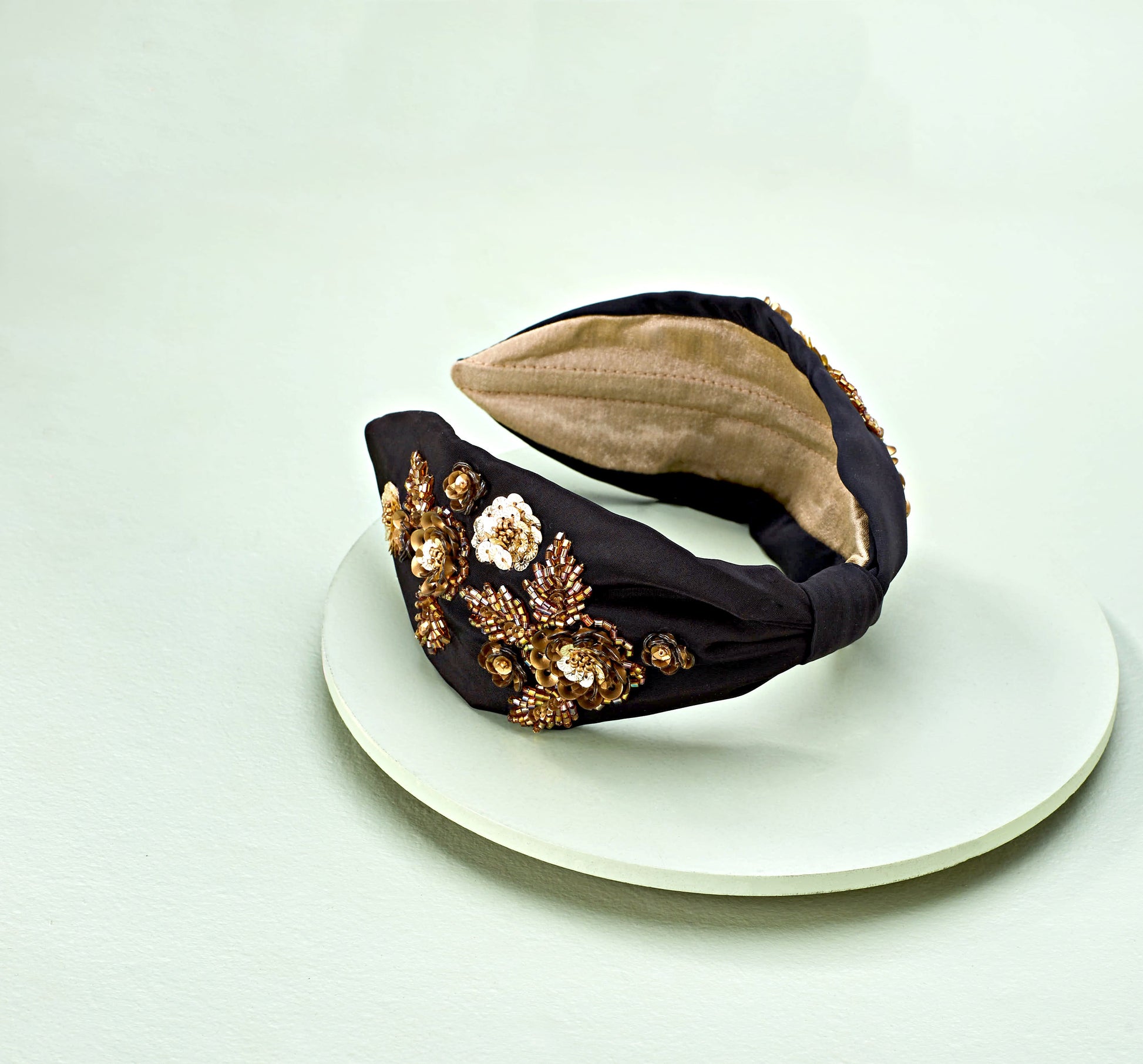 Take your look to new heights ,whether for day or evening with this Kendall Black headband. Crafted from Crepe it has premium & modern feel & is embellished with a collection of antique gold beads and crystals for a glamorous finish. Sewn over a metal hairband wearer gets a good grip.