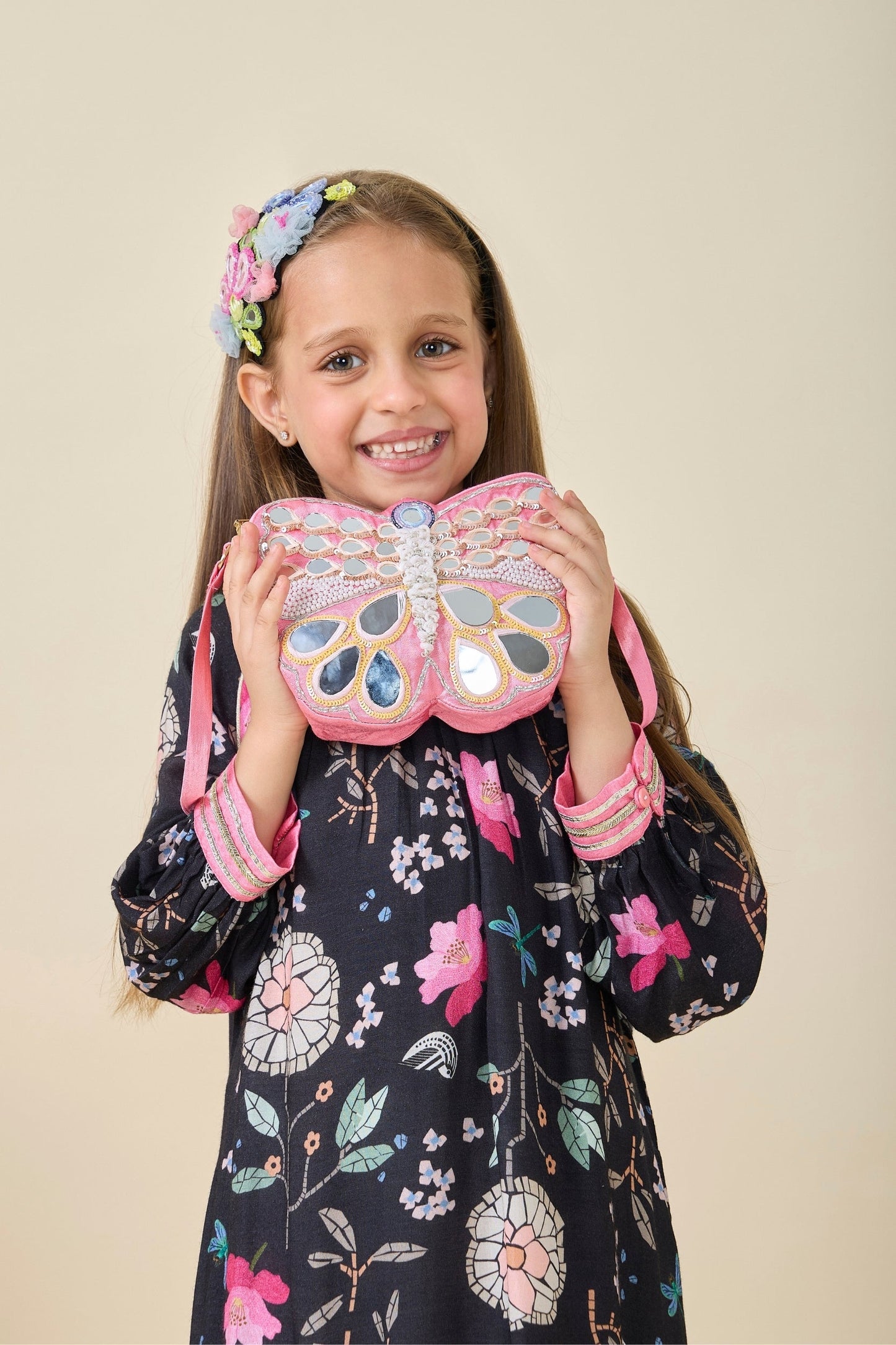 Meet our Pink Butterfly Bag, the ideal accessory for your little one. This eye-catching bag is embellished with mirrorwork, pearls, and delicate threadwork, all beautifully finished with silver pitta work. A whimsical and stylish addition to any outfit!