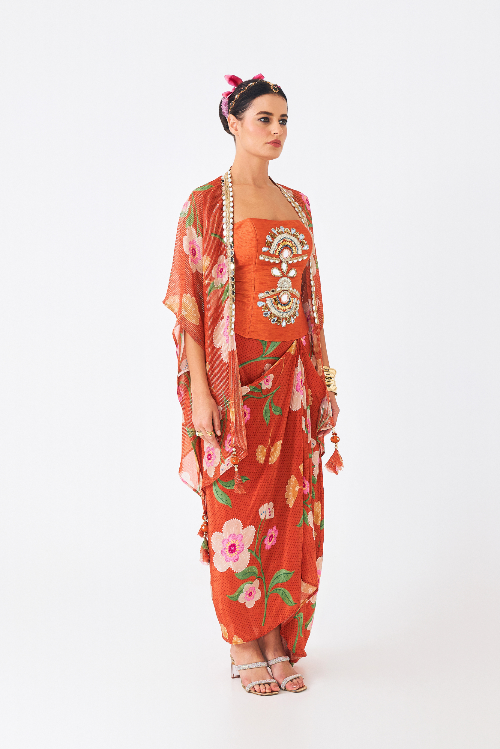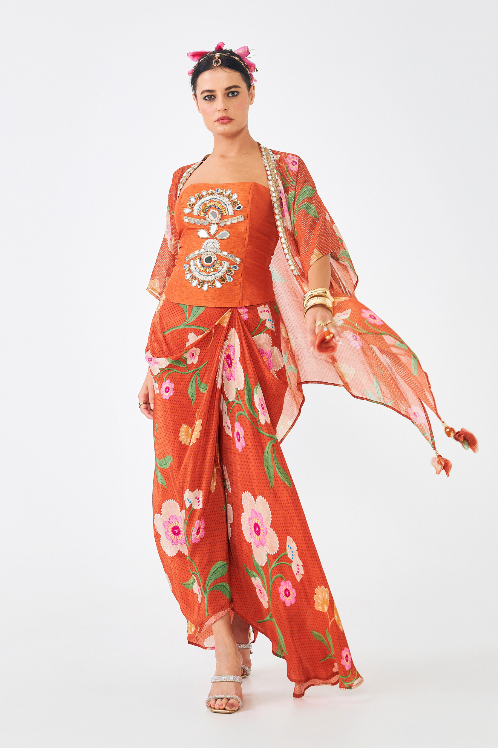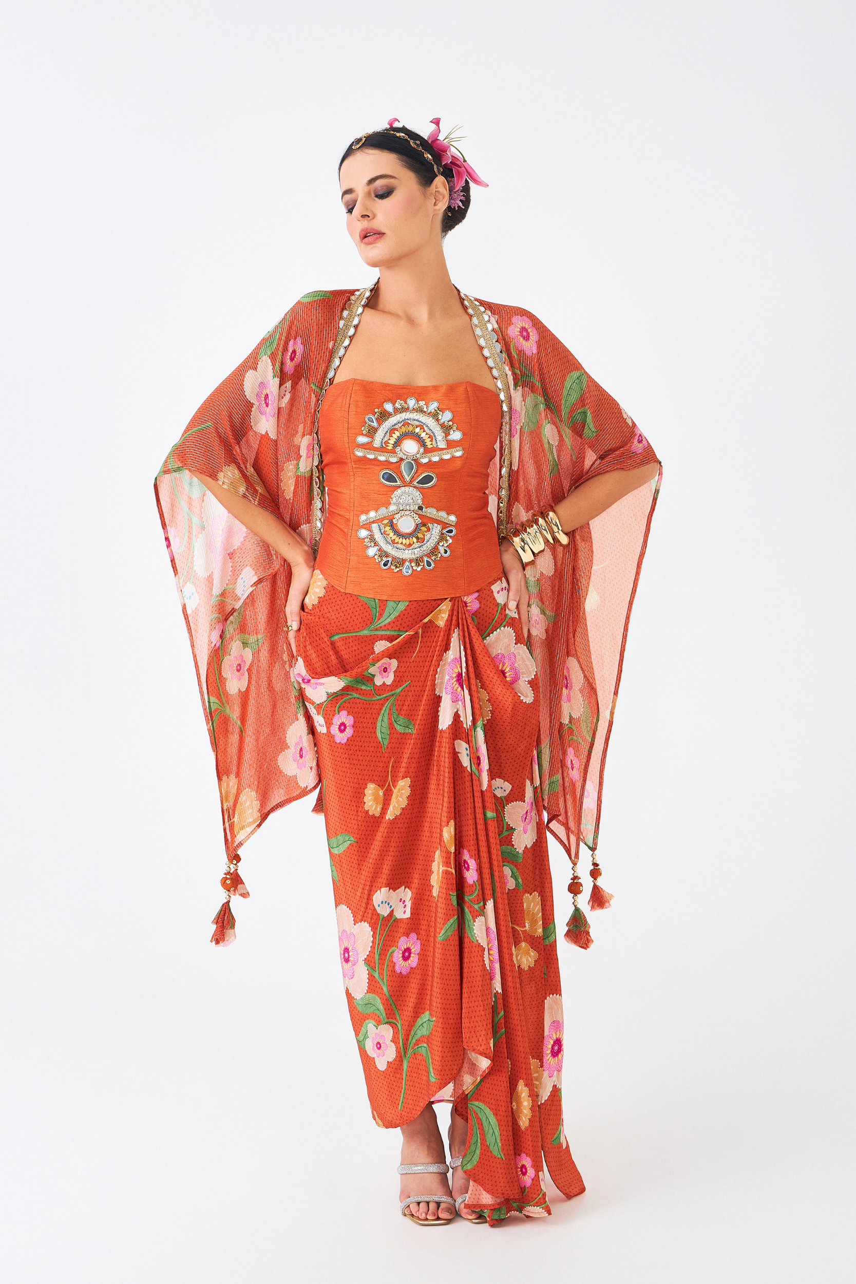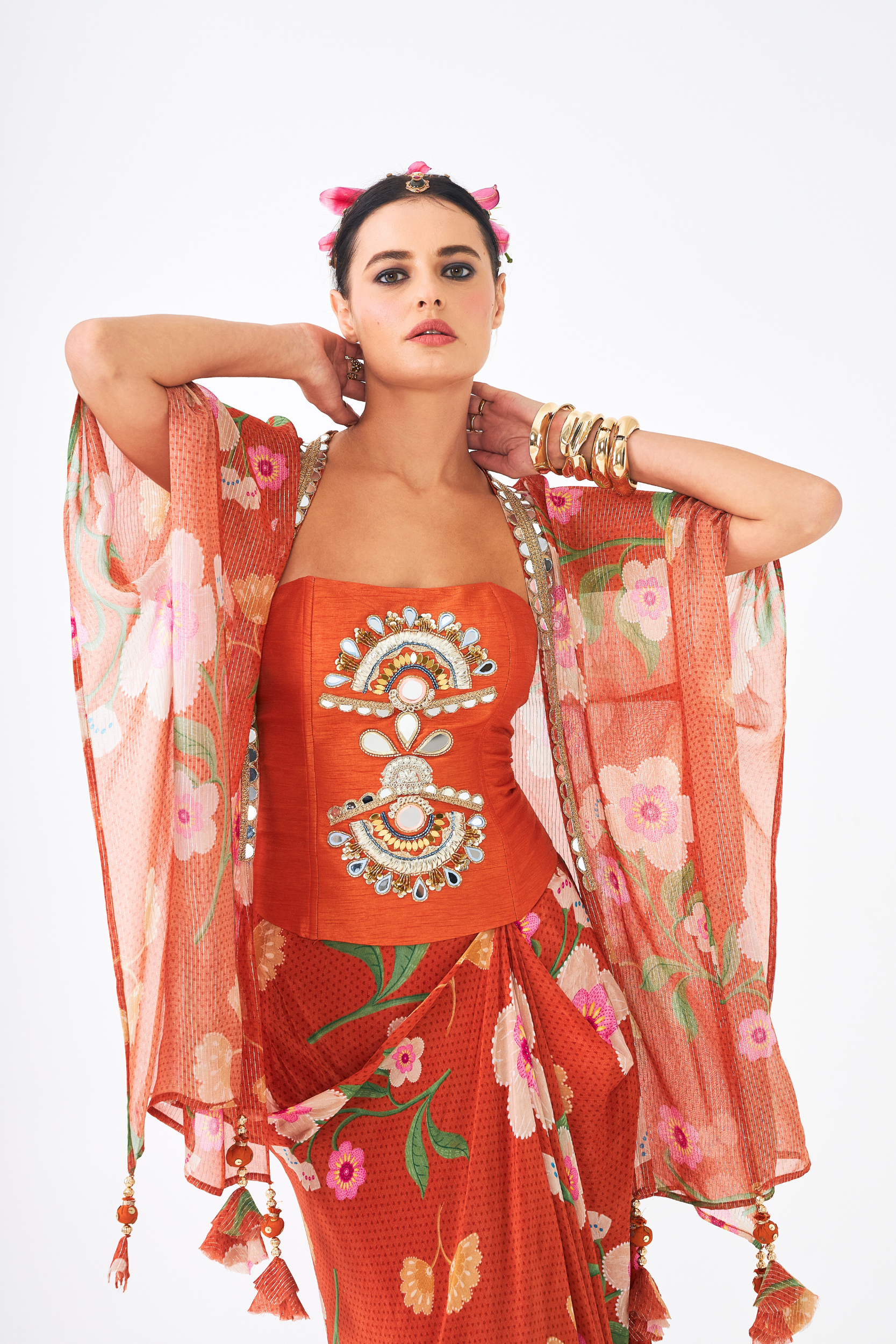 The Riva Embellished Corset With Draped Skirt & Cape (3 Pcs) is a Striking Bold Ensemble That Blends Contemporary Design With Intricate Craftsmanship. Made for the Modern Woman. The Solid Rust-orange Corset Features Exquisite Hand-embellishment at the Centre With Mirrorwork, Gold Pitta, Cutdana, Gota, Acrylic Sequins, and Tikki, Finished With Adjustable Crisscross Back Tie-ups and Handmade Tassels. Paired With a Flowing Riva-printed Draped Skirt and a Matching Cape, the Set Offers Drama, Movement, and Elegance. Both the Corset and Skirt Are Fully Lined for Comfort, Making This Outfit a Perfect Choice for Festive Occasions, Cocktail Evenings, and Modern Weddings.