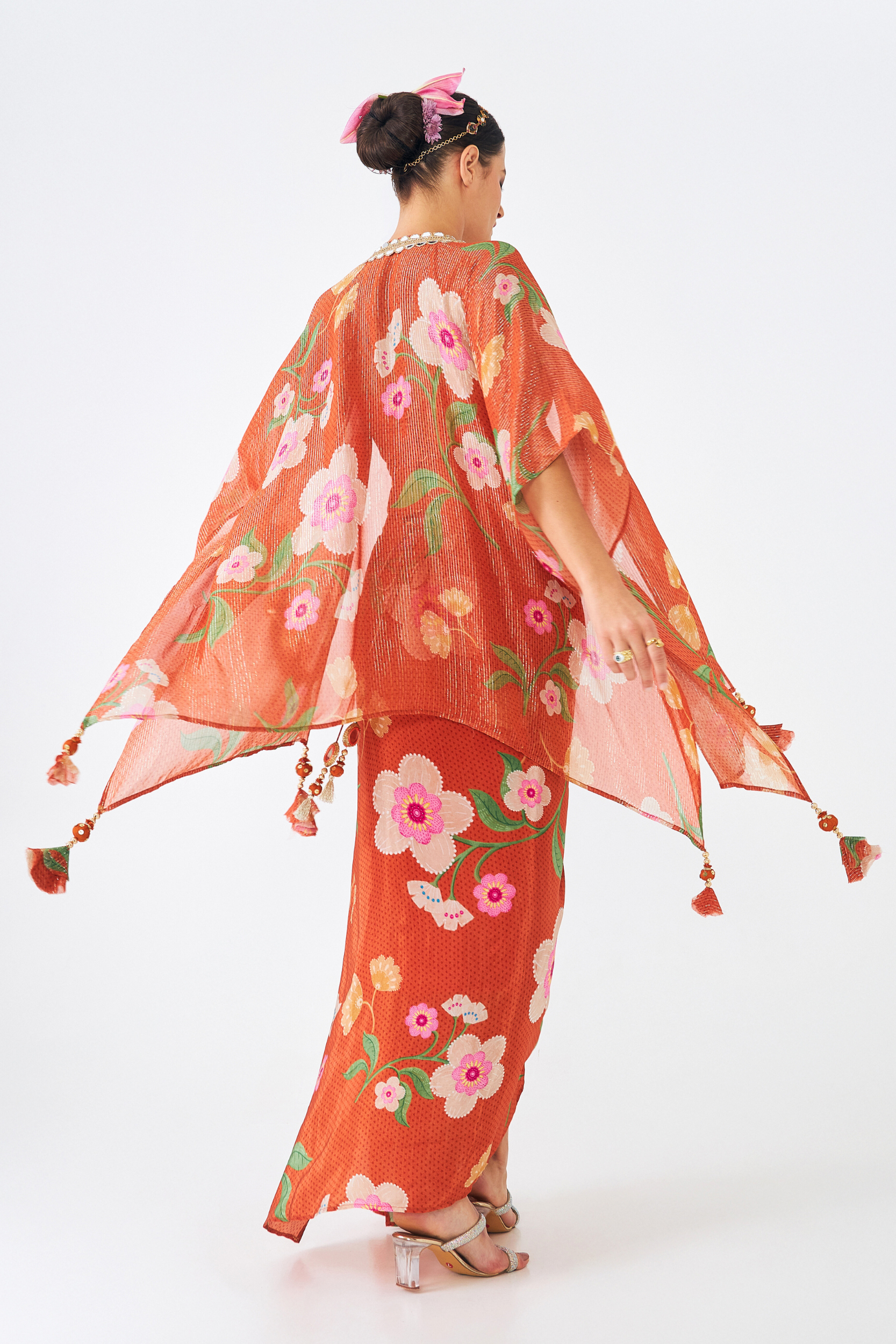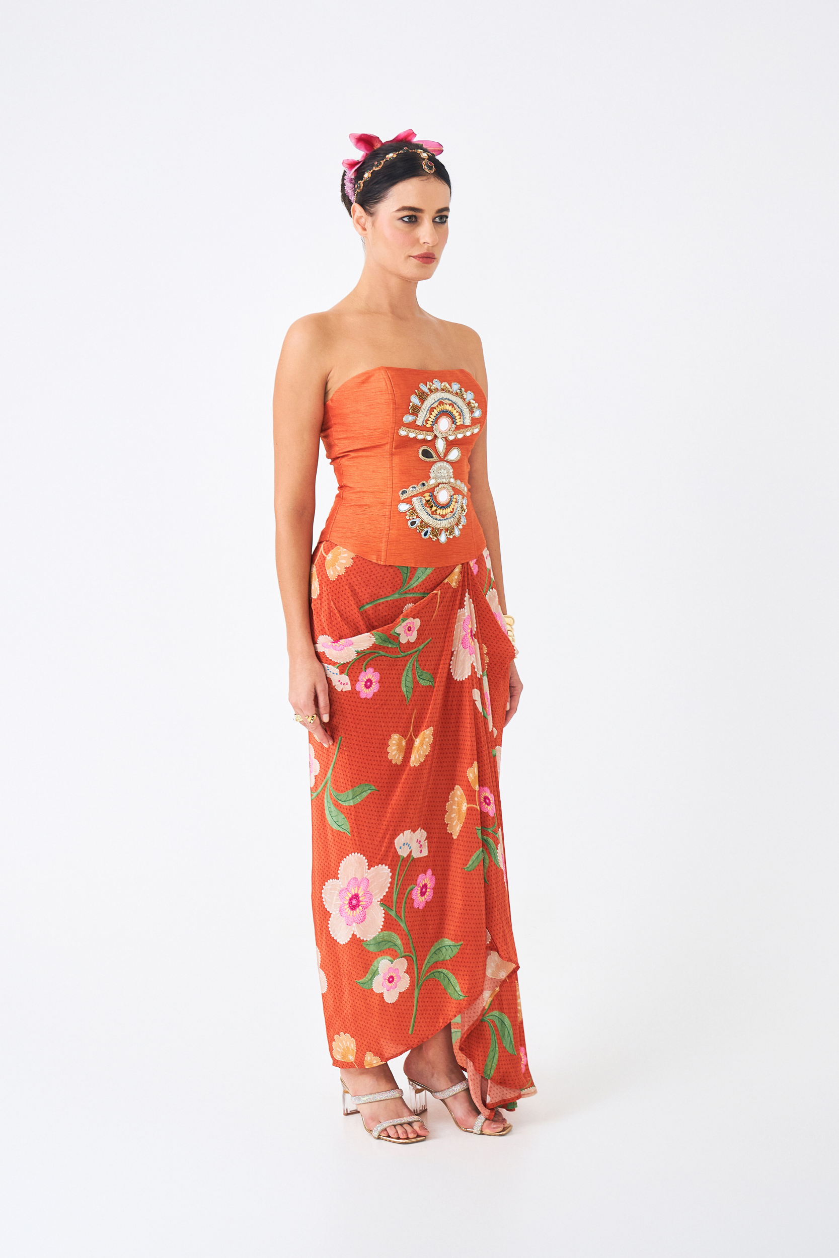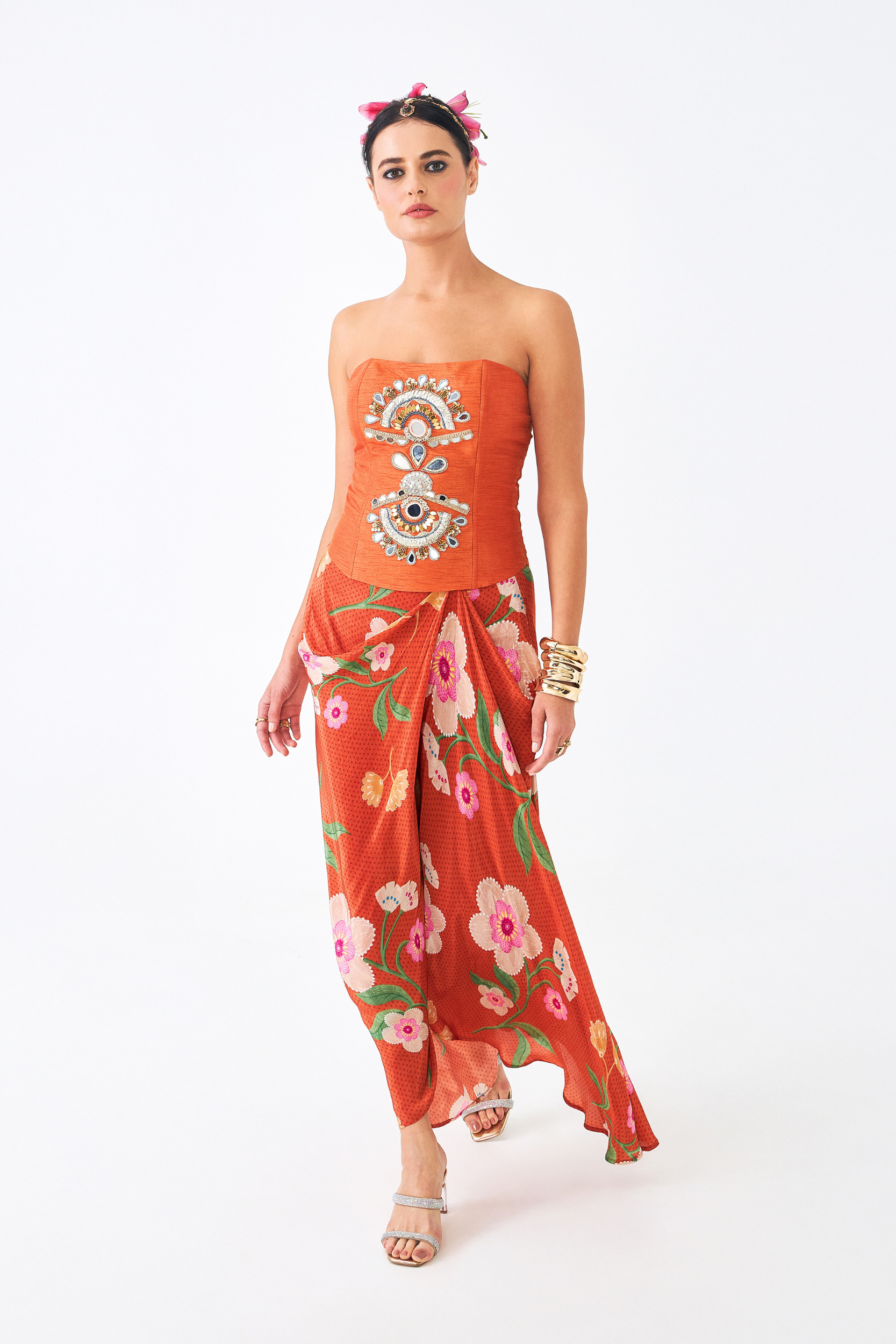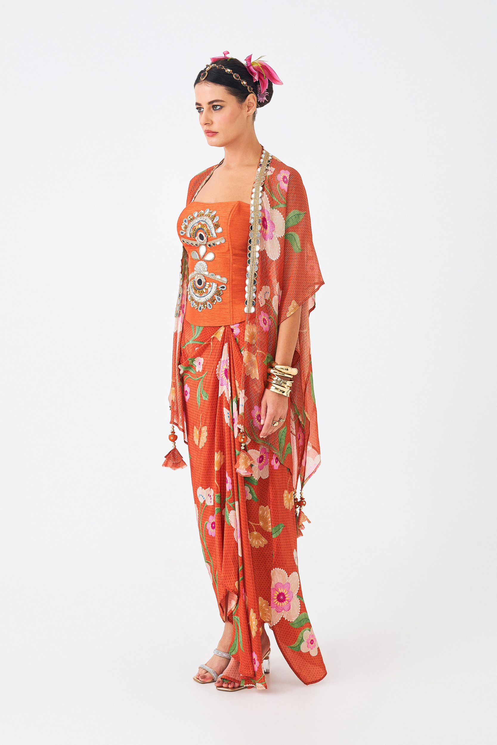 The Riva Embellished Corset With Draped Skirt & Cape (3 Pcs) is a Striking Bold Ensemble That Blends Contemporary Design With Intricate Craftsmanship. Made for the Modern Woman. The Solid Rust-orange Corset Features Exquisite Hand-embellishment at the Centre With Mirrorwork, Gold Pitta, Cutdana, Gota, Acrylic Sequins, and Tikki, Finished With Adjustable Crisscross Back Tie-ups and Handmade Tassels. Paired With a Flowing Riva-printed Draped Skirt and a Matching Cape, the Set Offers Drama, Movement, and Elegance. Both the Corset and Skirt Are Fully Lined for Comfort, Making This Outfit a Perfect Choice for Festive Occasions, Cocktail Evenings, and Modern Weddings.