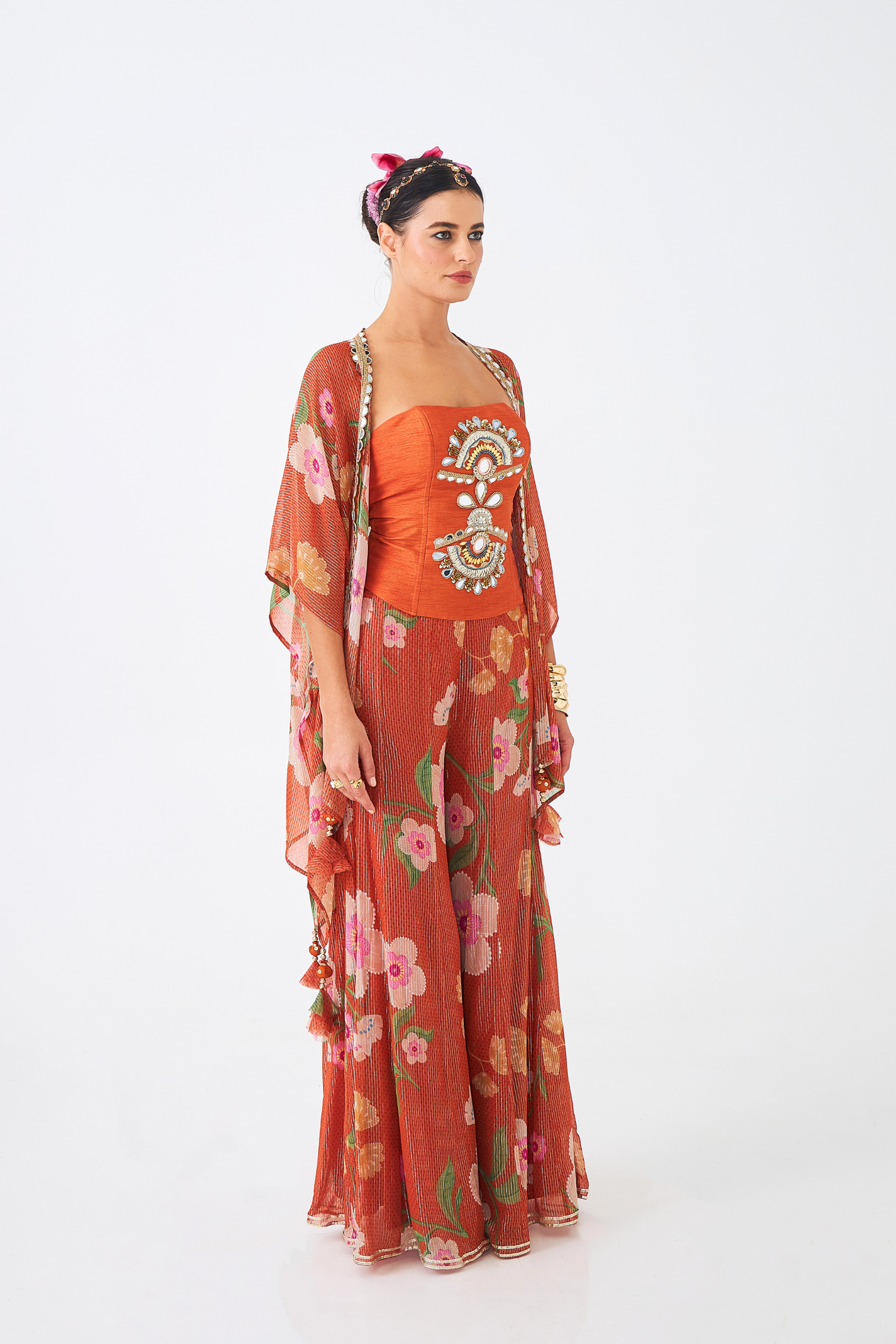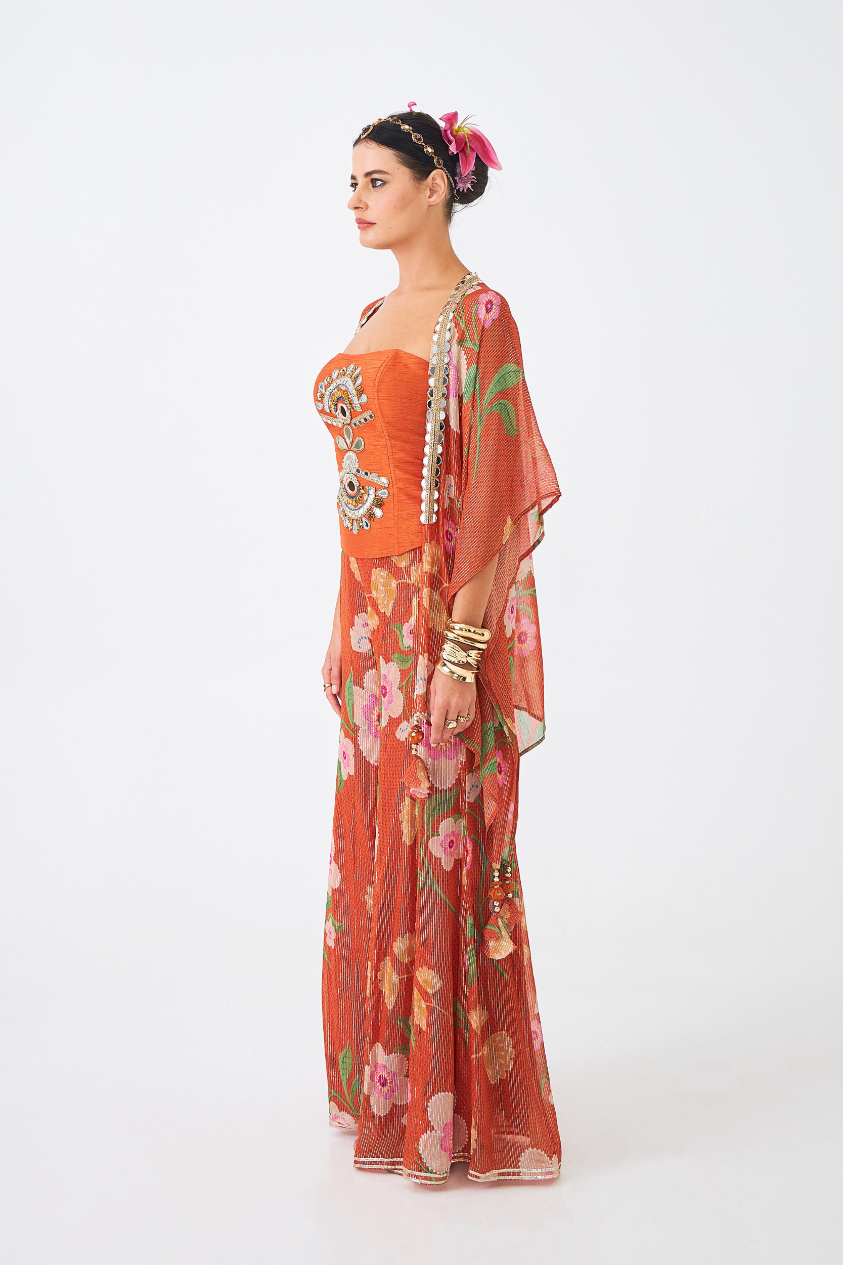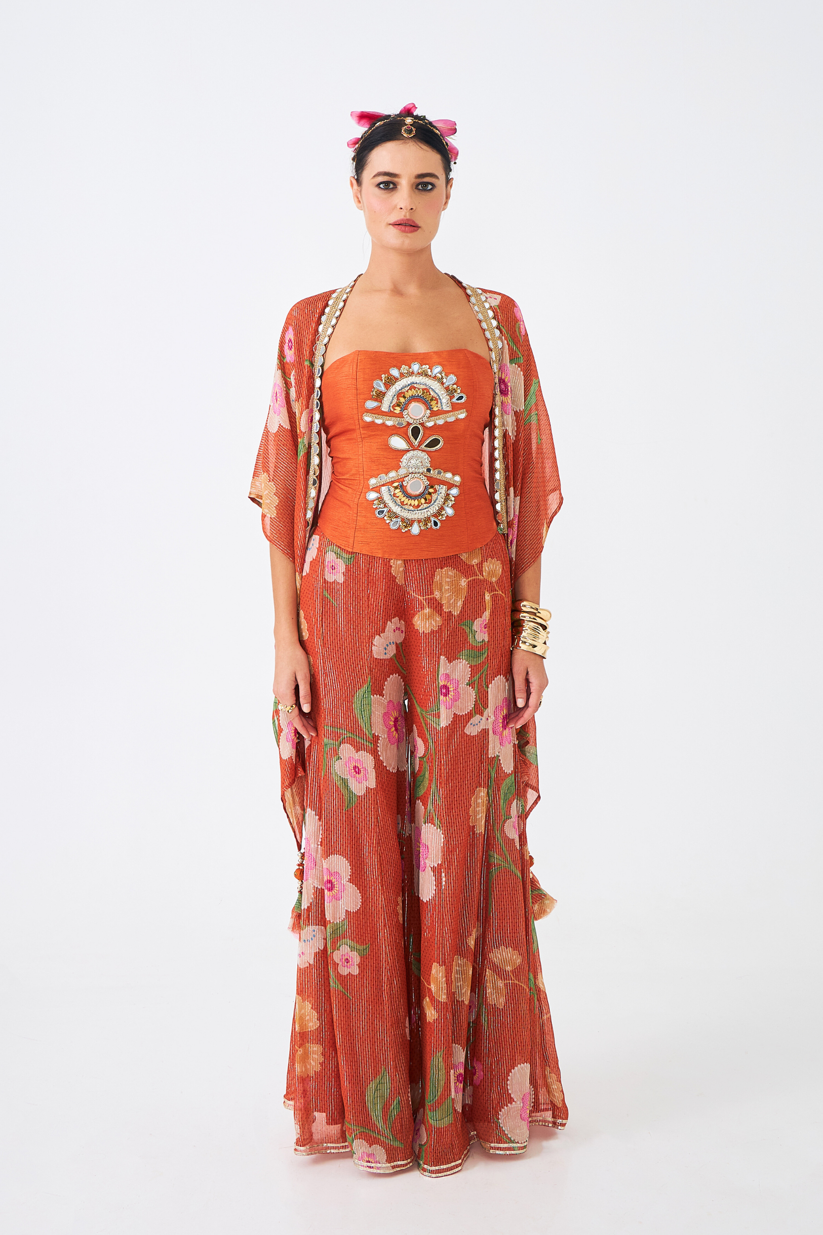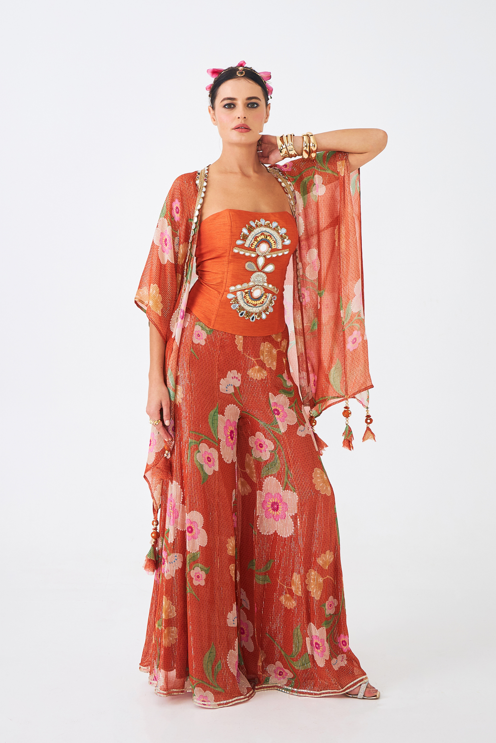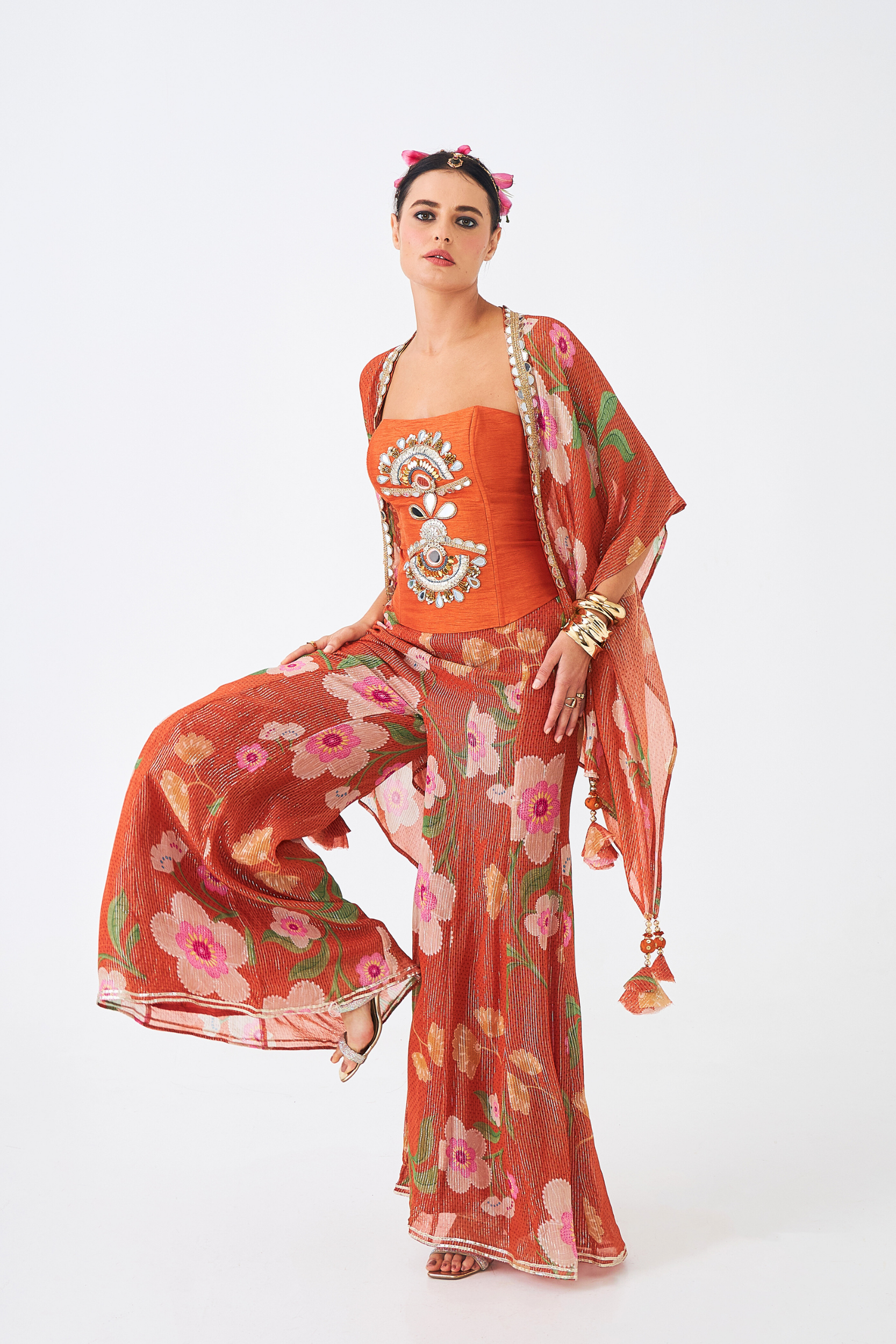 The Riva Embellished Corset With Flared Trousers & Cape (3 Pcs) is a Striking Bold Ensemble That Blends Contemporary Design With Intricate Craftsmanship. Made for the Modern Woman. The Solid Rust-orange Corset Features Exquisite Hand-embellishment at the Centre With Mirrorwork, Gold Pitta, Cutdana, Gota, Acrylic Sequins, and Tikki, Finished With Adjustable Crisscross Back Tie-ups and Handmade Tassels. Paired With a Flowing Riva-printed Flared Trousers and a Matching Cape, the Set Offers Drama, Movement, and Elegance. Both the Corset and Skirt Are Fully Lined for Comfort, Making This Outfit a Perfect Choice for Festive Occasions, Cocktail Evenings, and Modern Weddings