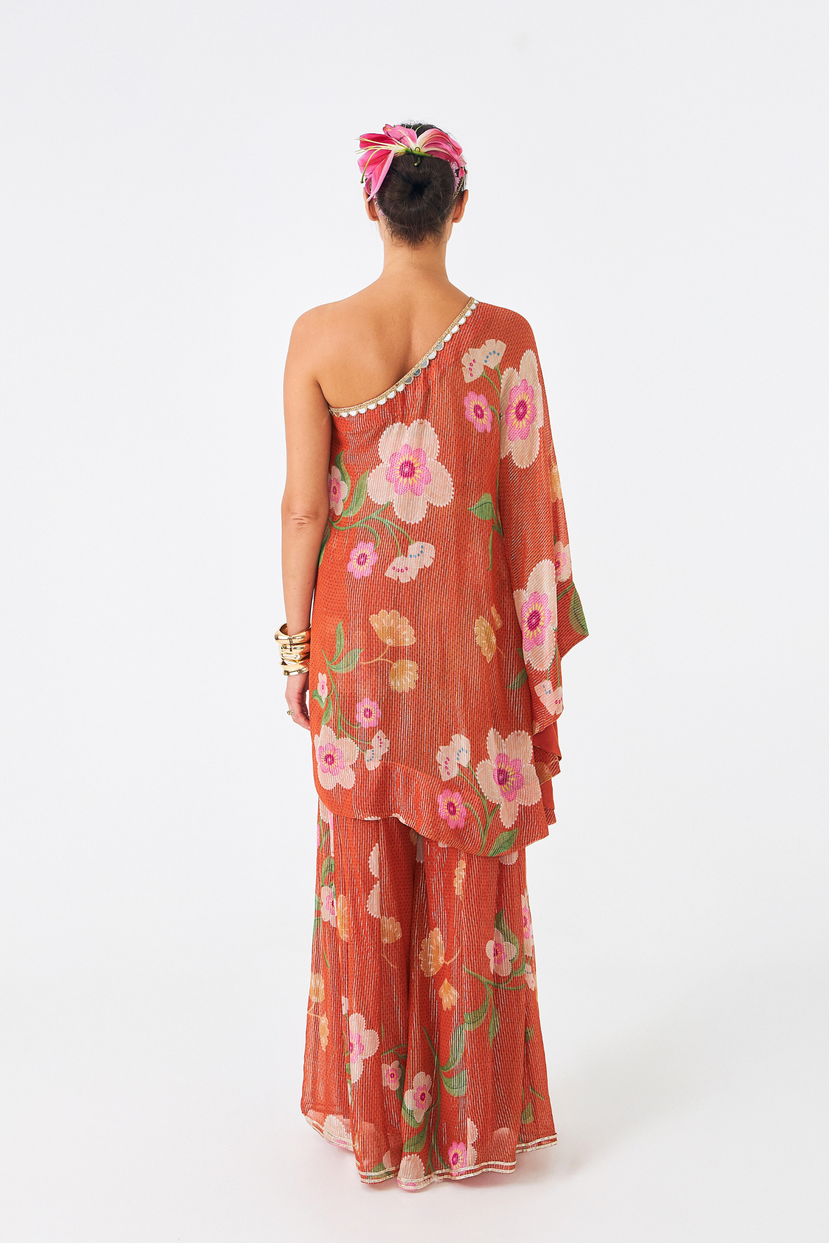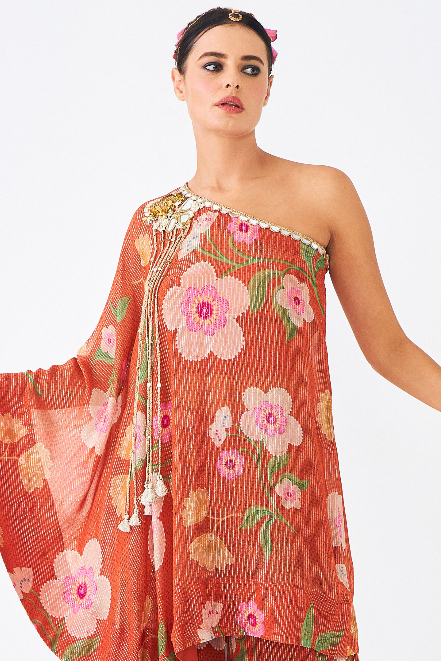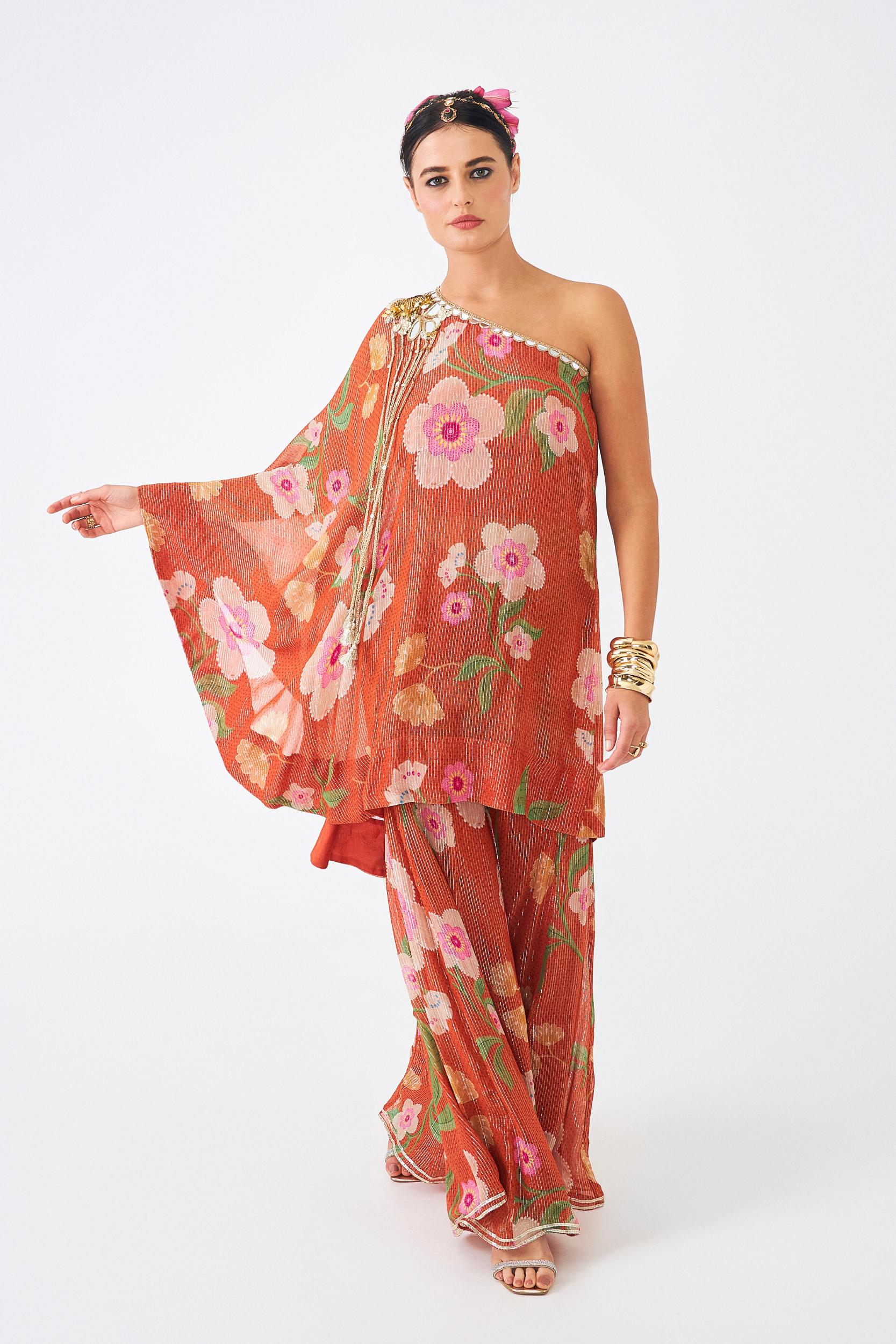 The Riva One-shoulder Tunic Set (3 Pcs) is a Statement Ensemble That Combines Fluid Elegance With Intricate Embellishment. Crafted in Shimmering Lurex Georgette With Our Signature Riva Print, the Asymmetrical Tunic is Adorned With Mirrorwork, Cutdana, and Acrylic Sequins, Finished With Long Braided Tassels for a Playful Edge. A Flared Full Sleeve Adds Drama to the Silhouette, While the Set is Styled With a Solid Bustier and Coordinated Flared Pants in the Same Print, Designed With an Elasticated Back Waistband for Comfort. Perfect for Cocktail Nights, Festive Soirées, and Modern Weddings, This Set is Both Effortless and Striking.
