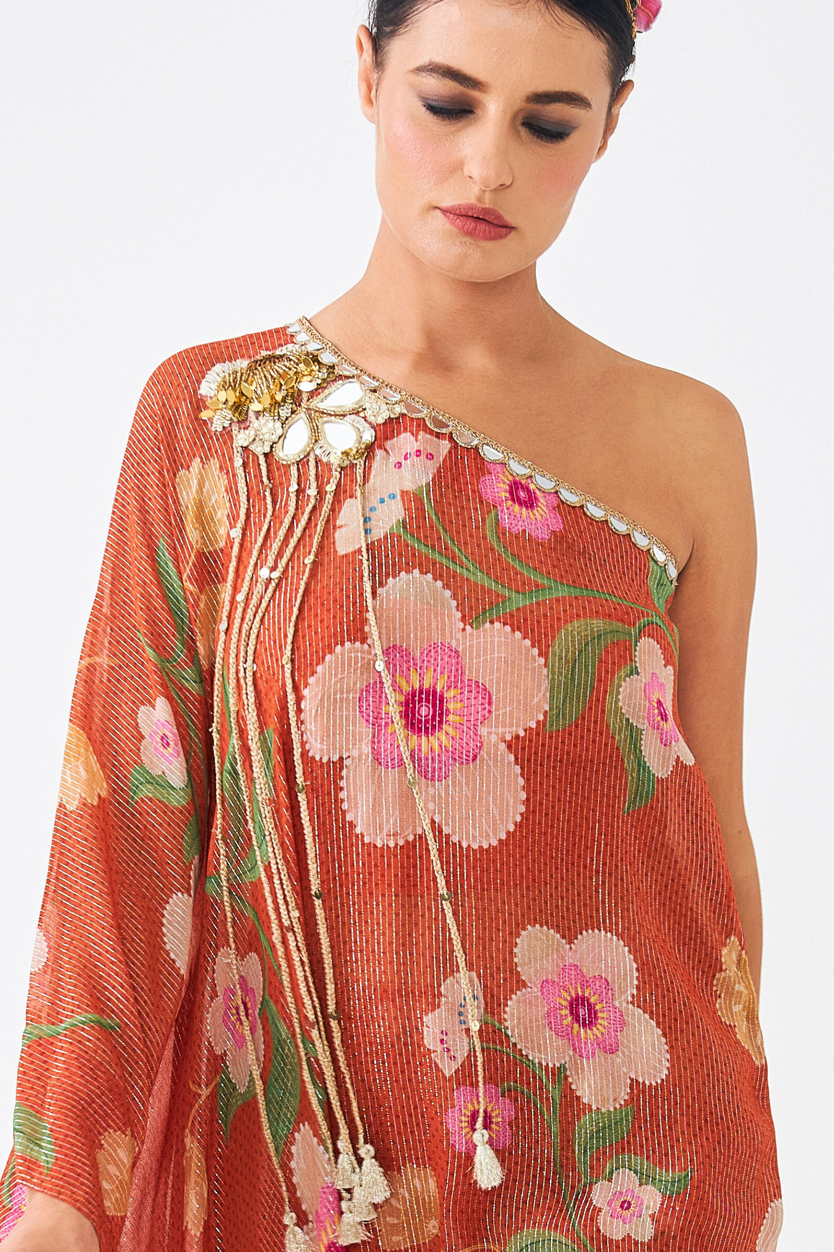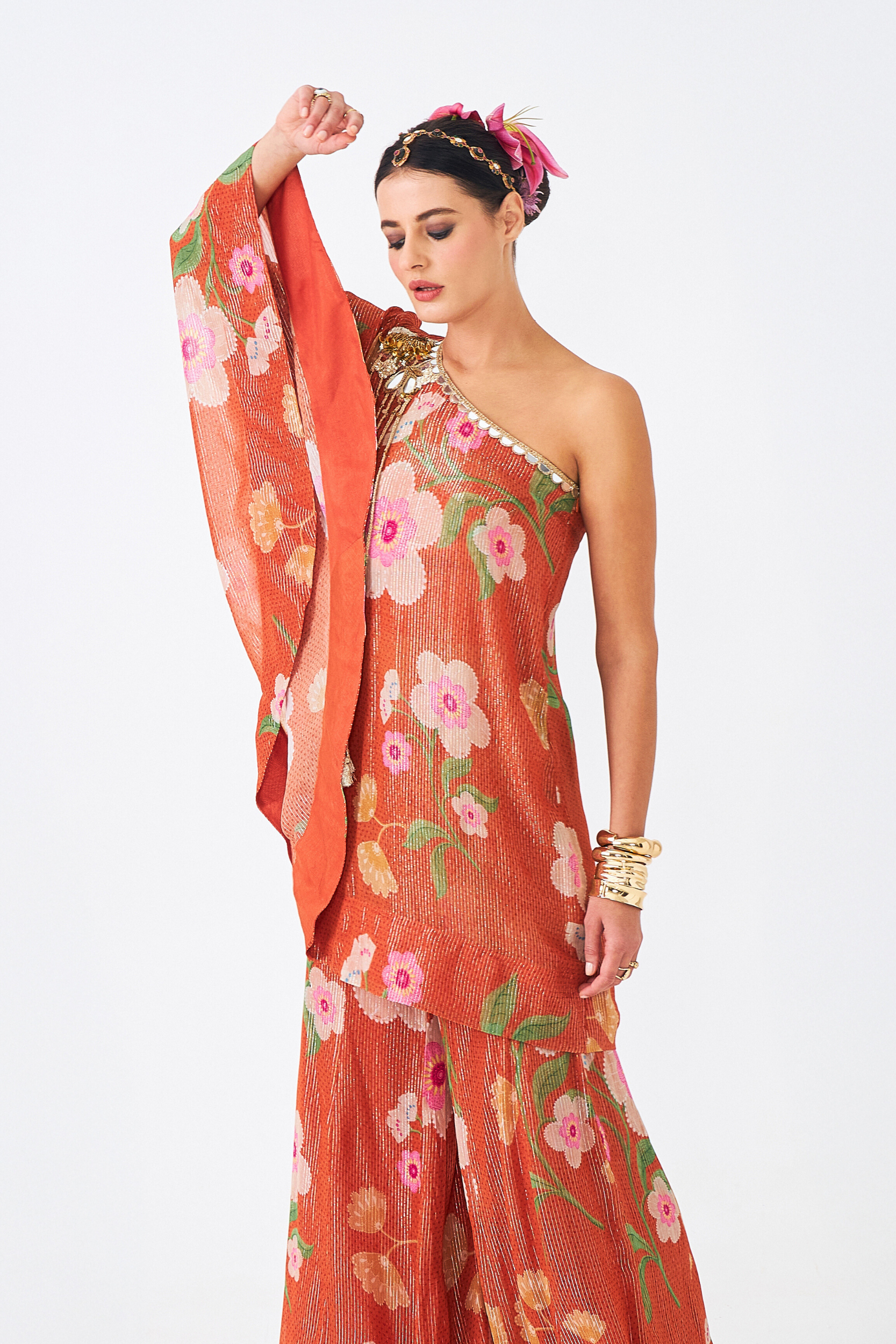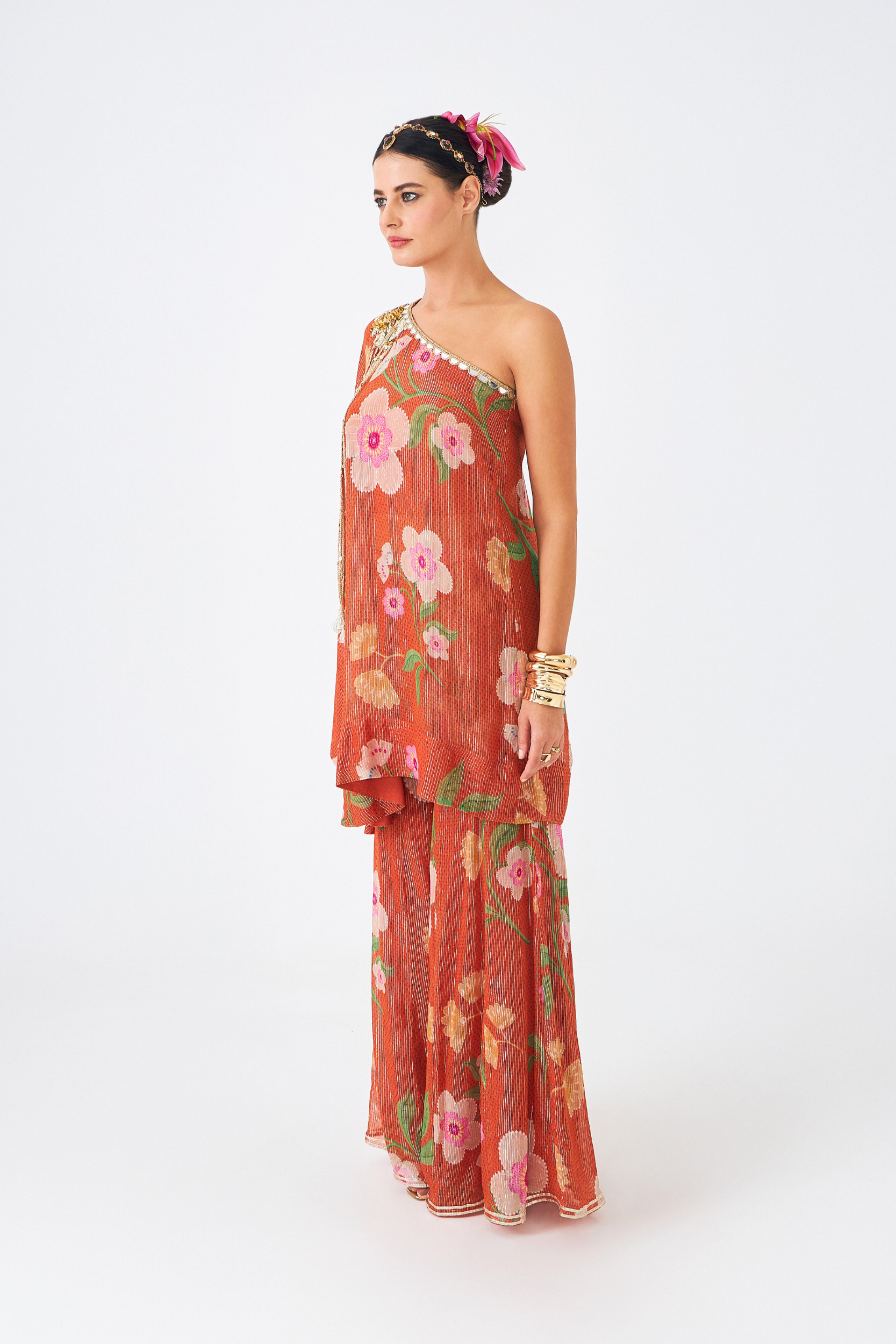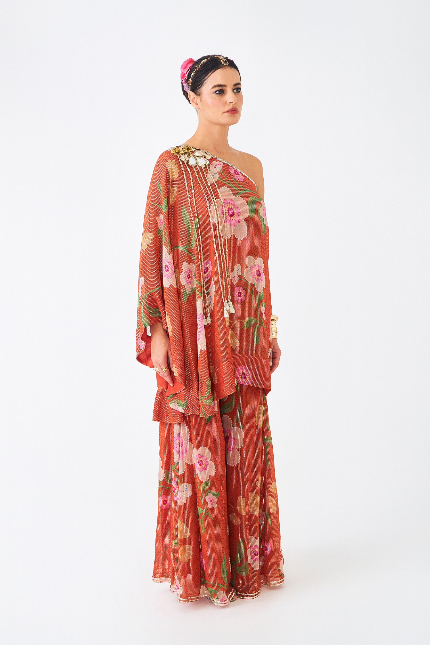 The Riva One-shoulder Tunic Set (3 Pcs) is a Statement Ensemble That Combines Fluid Elegance With Intricate Embellishment. Crafted in Shimmering Lurex Georgette With Our Signature Riva Print, the Asymmetrical Tunic is Adorned With Mirrorwork, Cutdana, and Acrylic Sequins, Finished With Long Braided Tassels for a Playful Edge. A Flared Full Sleeve Adds Drama to the Silhouette, While the Set is Styled With a Solid Bustier and Coordinated Flared Pants in the Same Print, Designed With an Elasticated Back Waistband for Comfort. Perfect for Cocktail Nights, Festive Soirées, and Modern Weddings, This Set is Both Effortless and Striking.