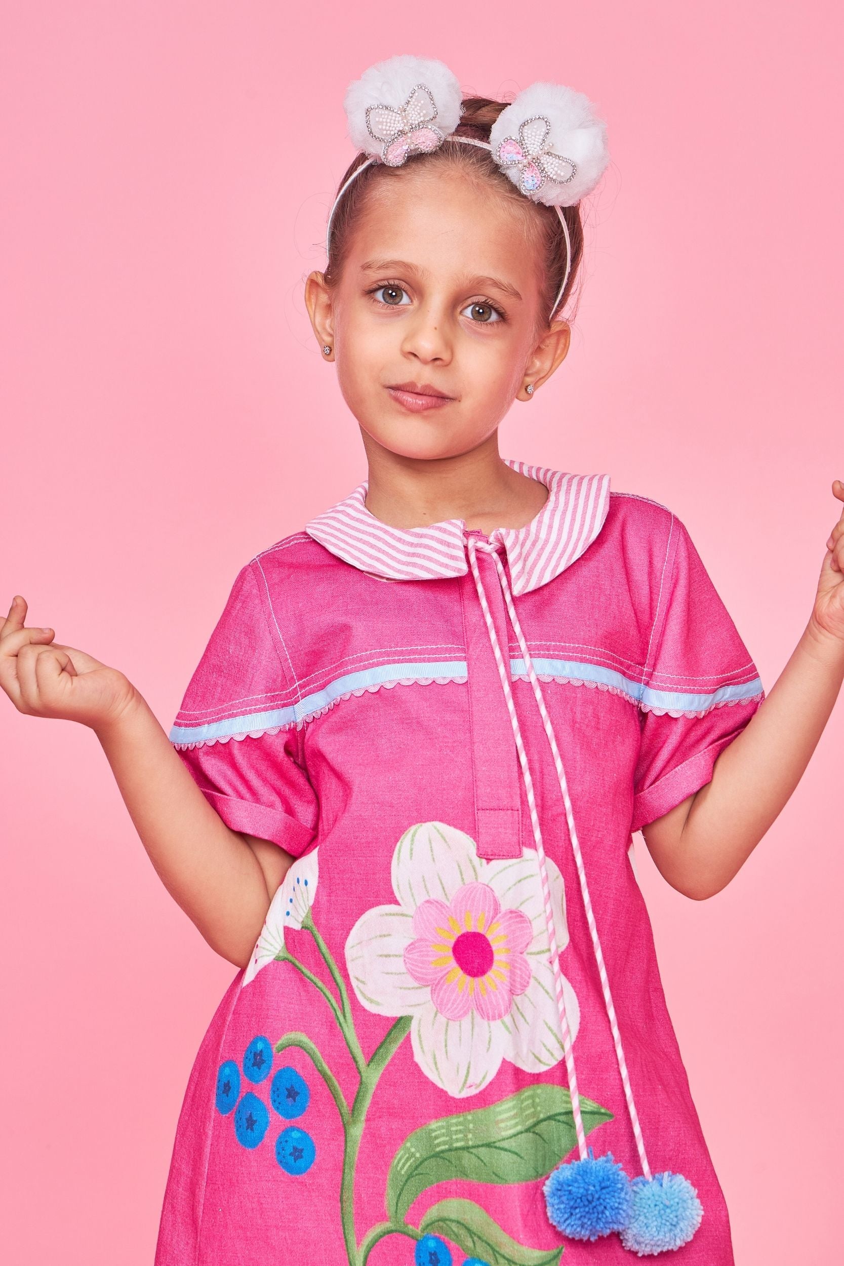 Our Rumi pink dress is a smart, statement-making piece with plenty of charm. Featuring a bold floral placement on both the front and back, a sweet striped collar, and playful pom-pom tie-ups, it’s the perfect choice for garden parties, outings, or any sunny day adventure.