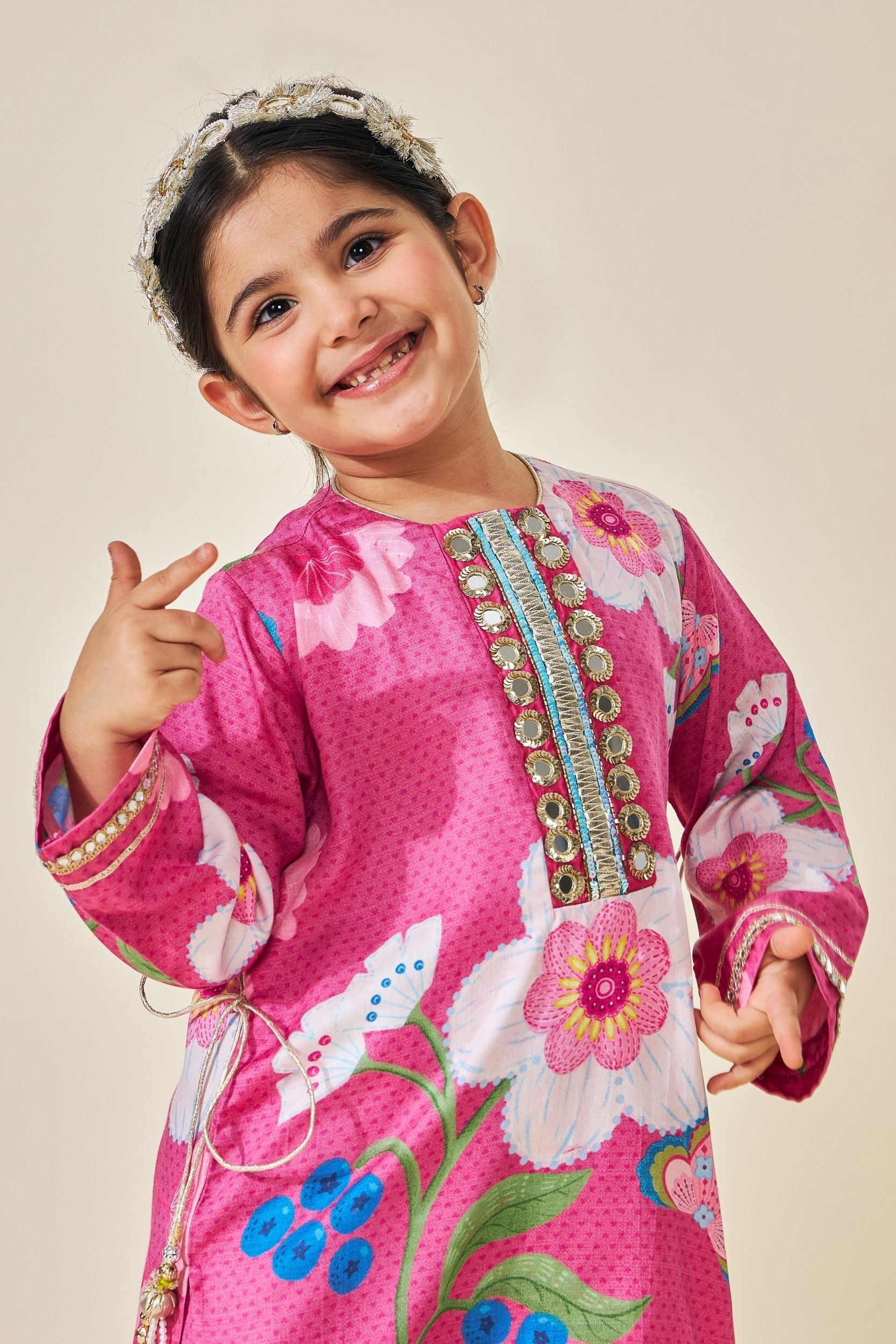The kurta stands out with its intricate hand embroidery, mirror work, and subtle embellishments that add just the right amount of sparkle. Delicate detailing near the sleeve ends and a signature tassel with golden accents add a touch of festive flair. Paired with pants featuring refined gota highlights, the ensemble is both polished and easy to wear. Perfect for festive occasions, this set is designed to make you shine effortlessly.