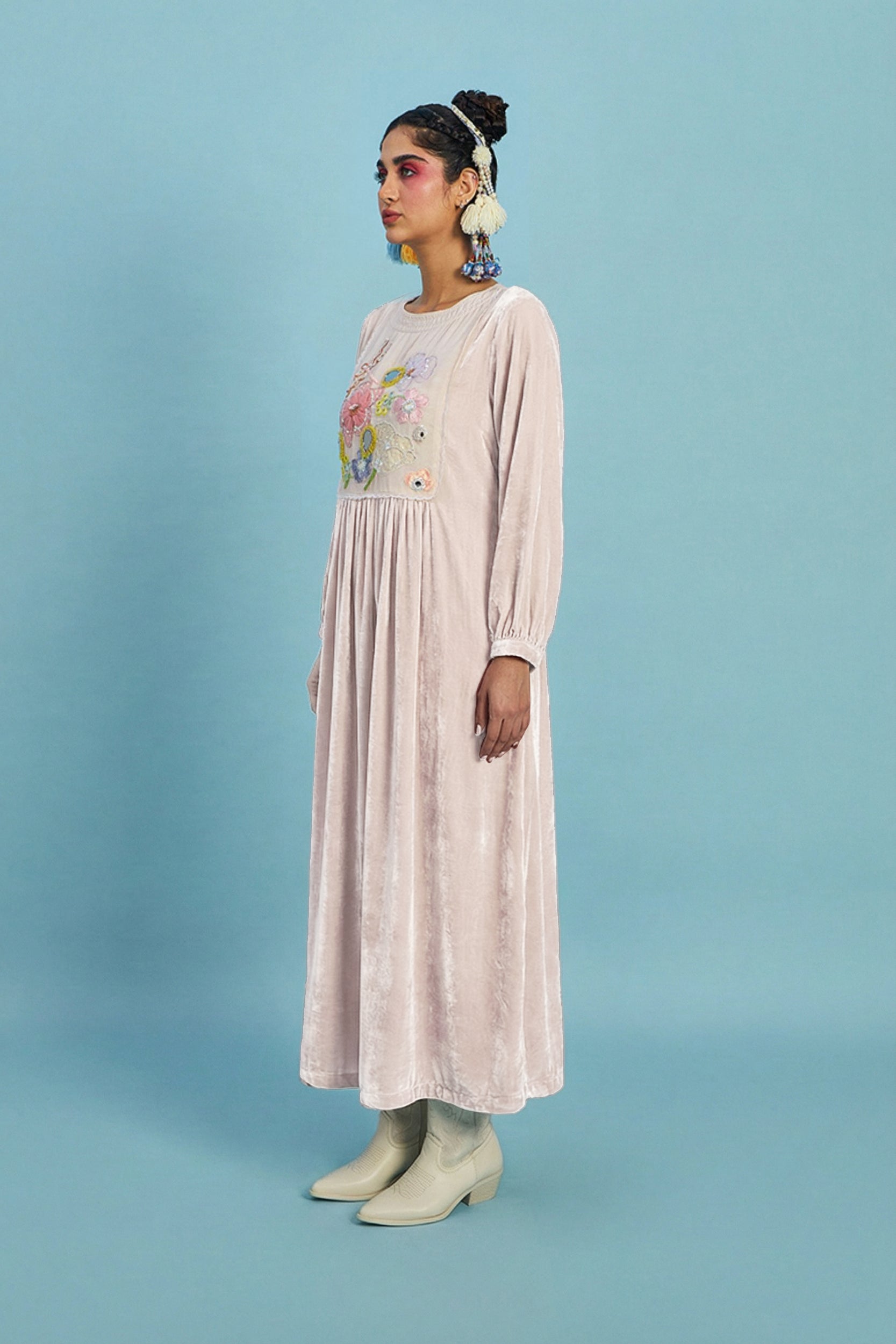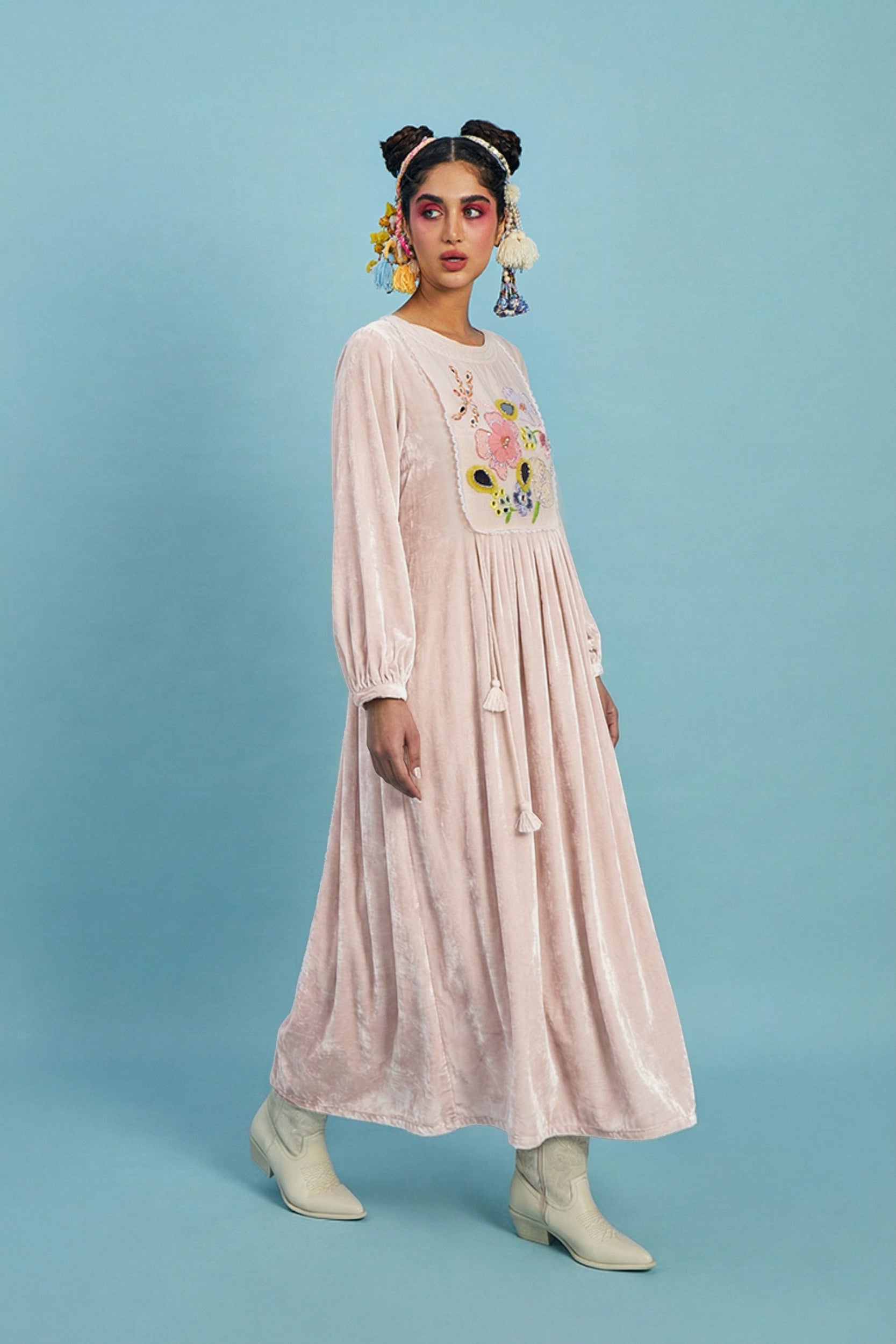 VELVET Mirror Yoke Embellished Ladies Long Dress (Light Peach color)